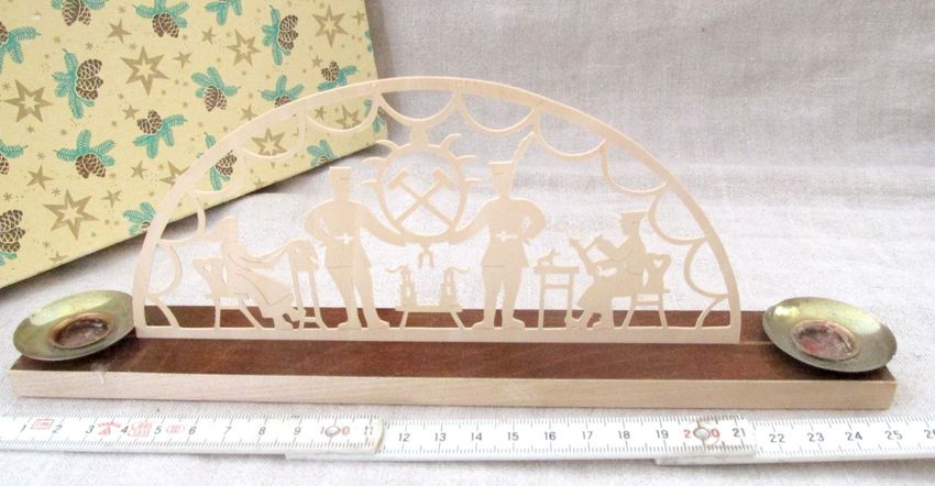 DDR Schwibbogen * Erzgebirgische Volkskunst Der Bogen besteht aus einer feinen Laubsägearbeit und läßt sich aus dem Fuß Sockel herausnehmen. Daher auch eine gute Aufbewahrungsmöglichkeit in einem flachen Karton. Gesamtbreite Sockel 27 cm * Wachsreste in den Tüllen, sonst sehr gute Erhaltung von Priv