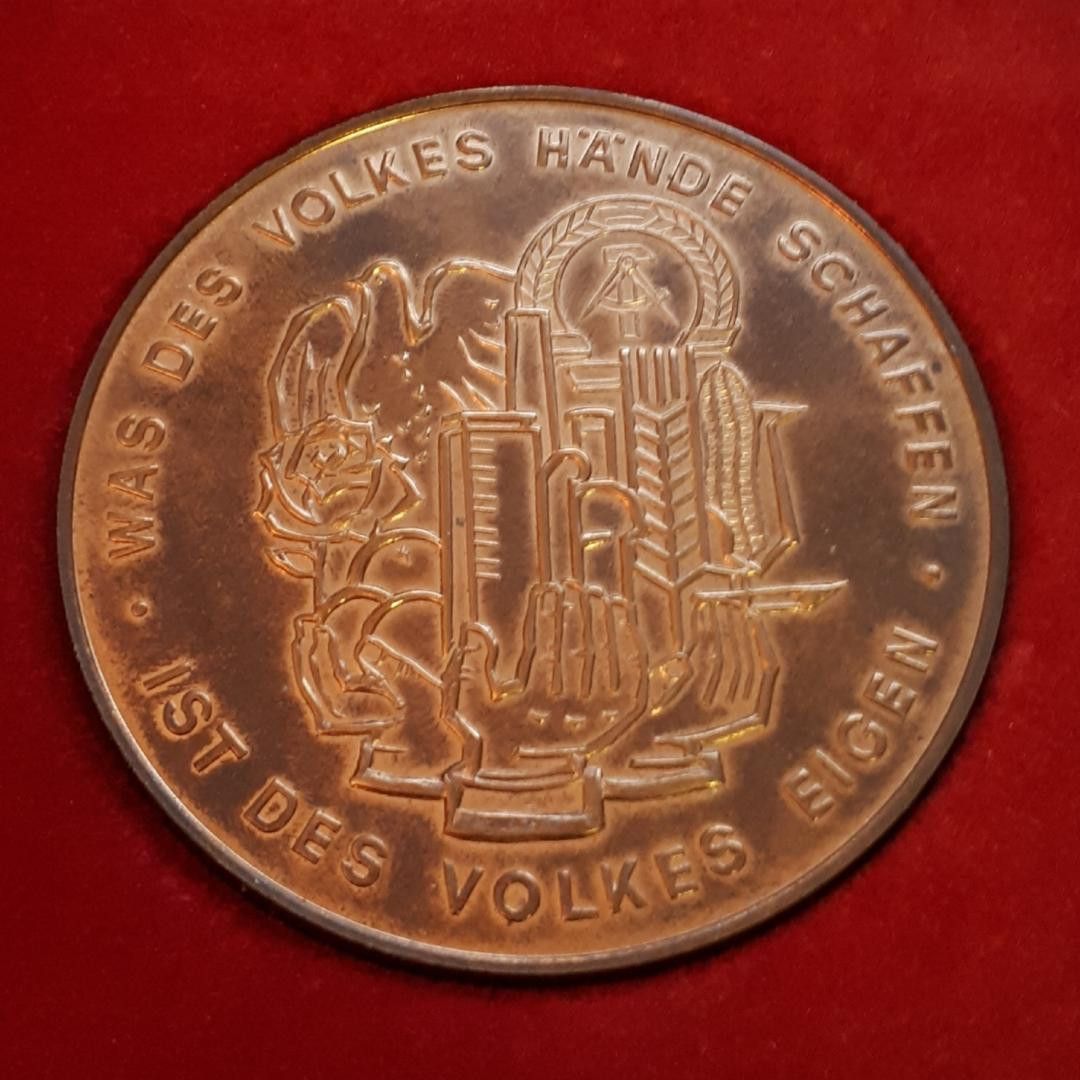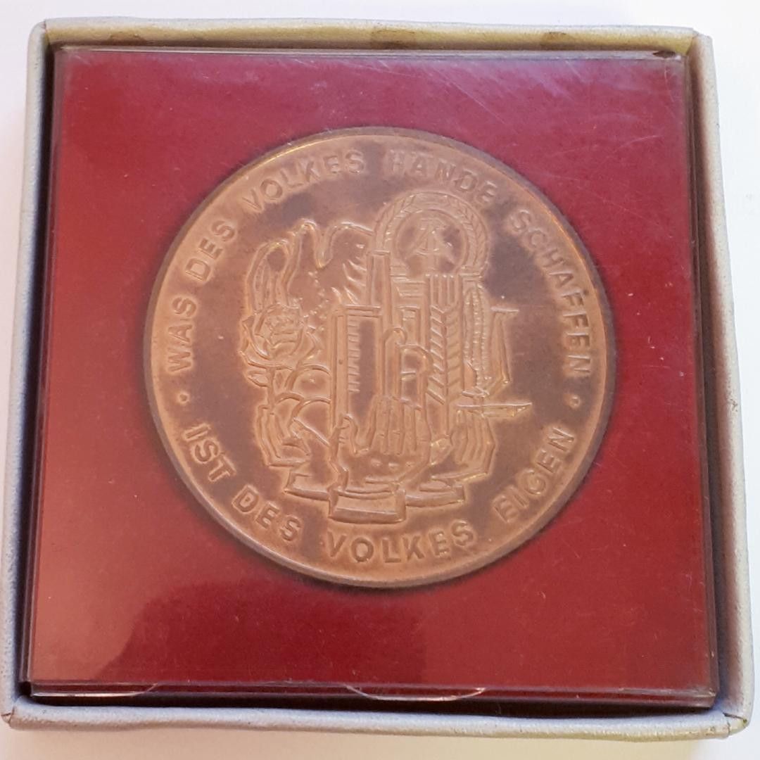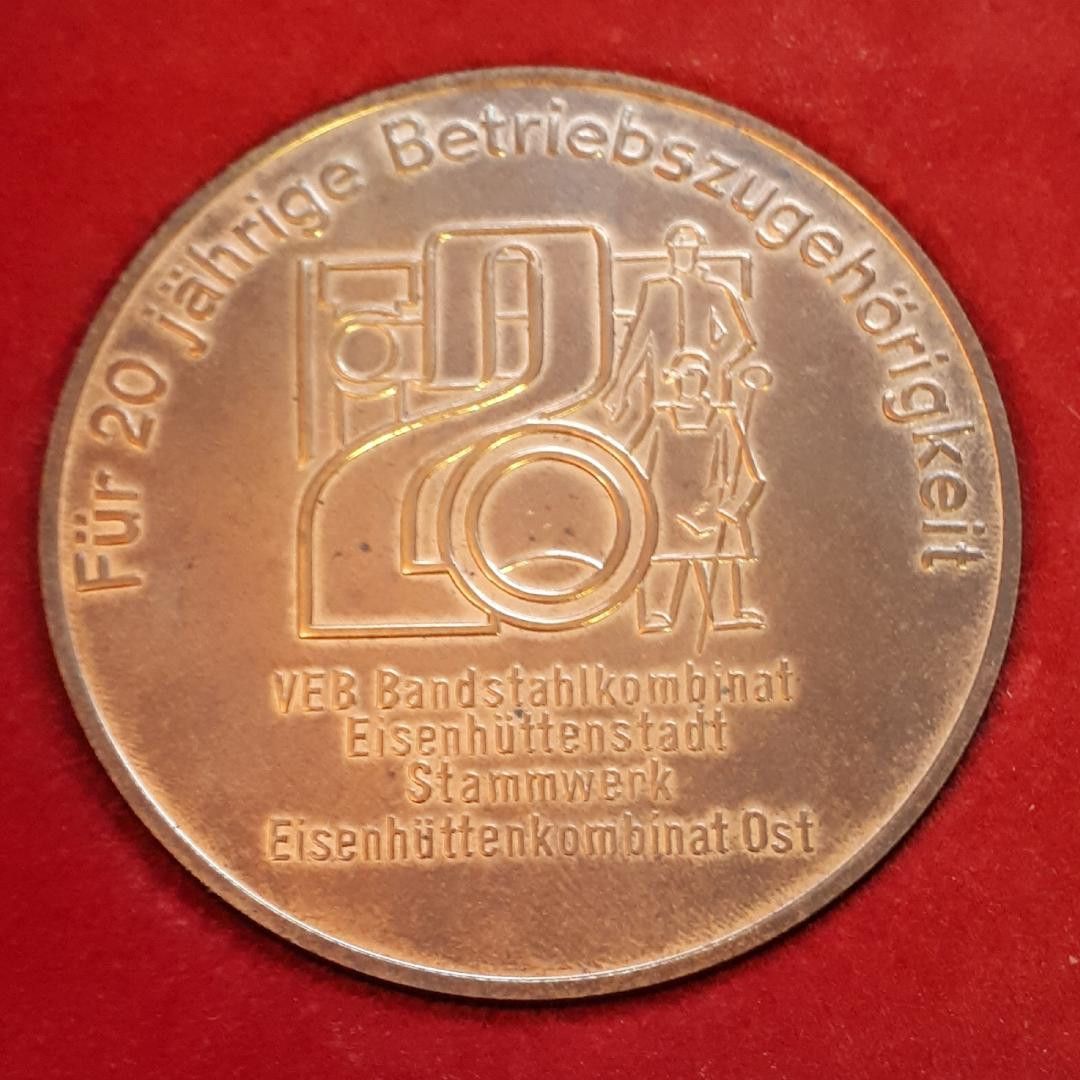 DDR Medaille Bandstahlkombinat Eisenhüttenstadt 20-jährige Betriebszugehörigkeit K.M. * Durchmesser: ca. 6 cm * Gewicht: ca. 84 g Zustand: gut - gebraucht mit kleinen Gebrauchsspuren (Verpackung weist einige Verschmutzungen auf)