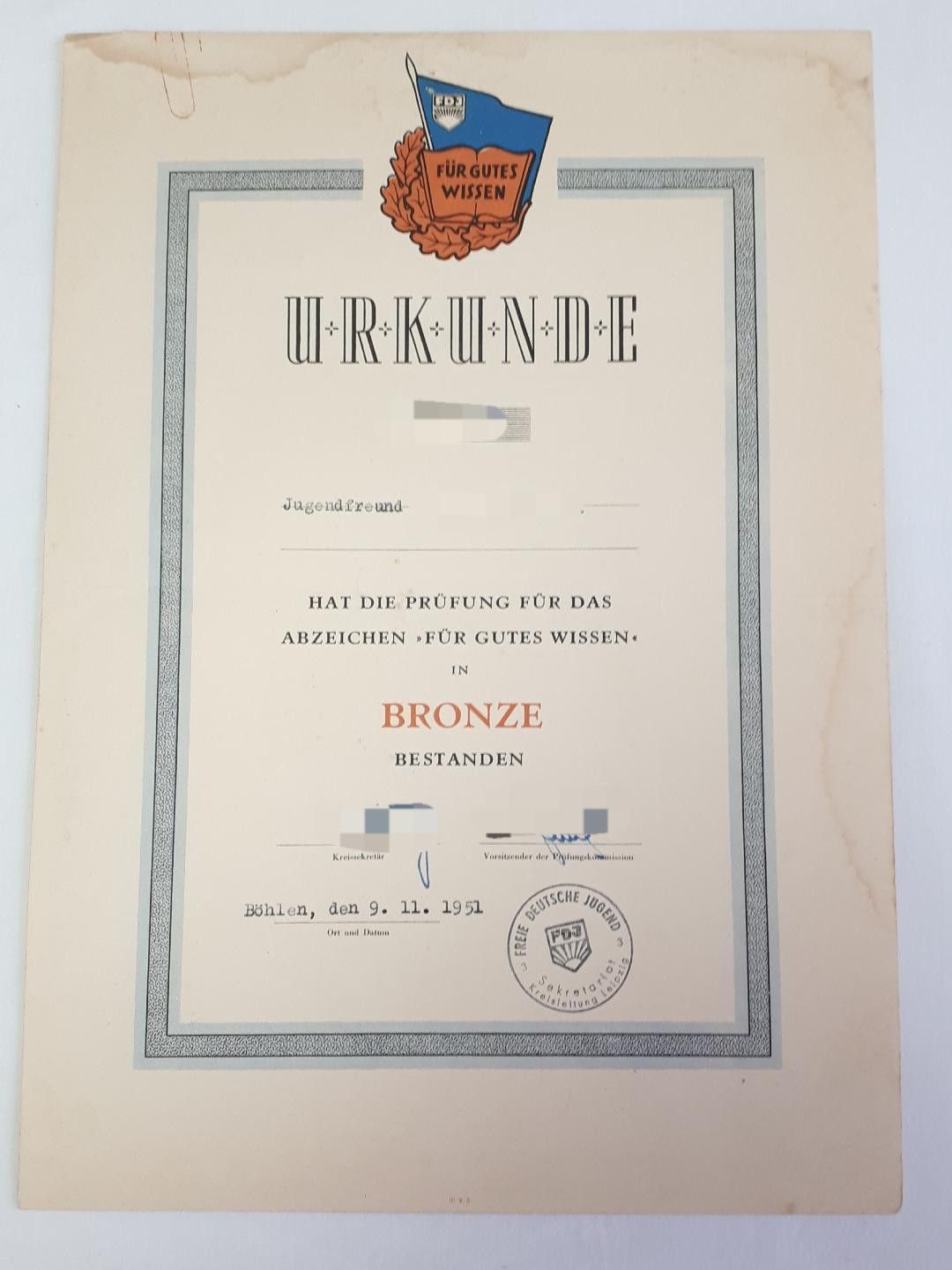 DDR Urkunde FDJ Für gutes Wissen in Bronze 1951