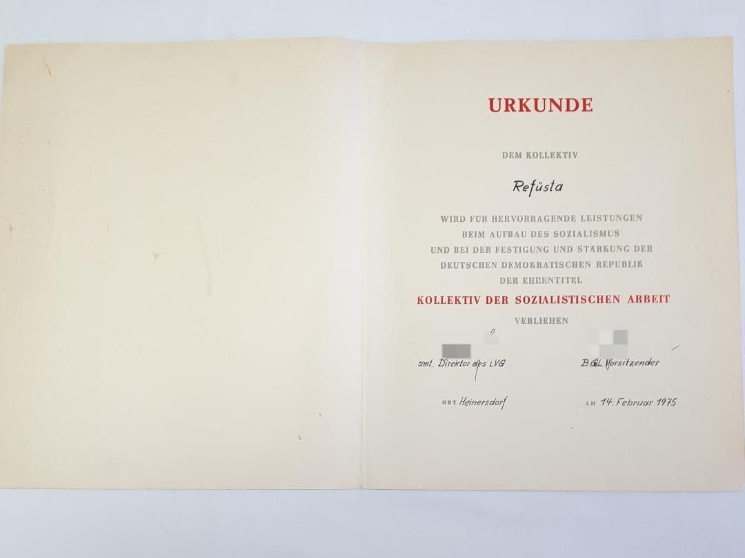 DDR Urkunde Kollektiv der sozialistischen Arbeit Refüsta Heinersdorf 1975