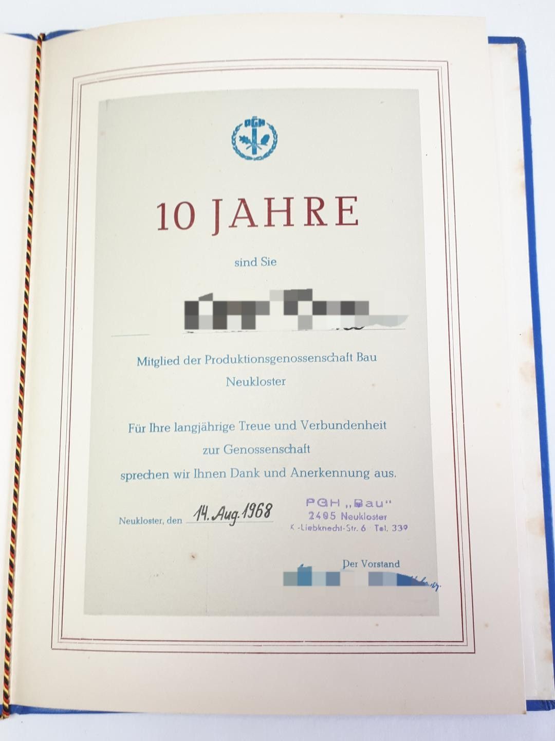 DDR Urkundenmappe mit Urkunde PGH Bau Neukloster 1968