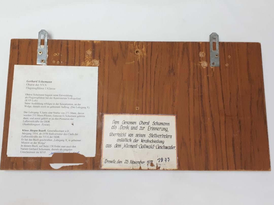 DDR Wandbild für Verabschiedung Oberst Schumann aus dem "Klement Gottwald" Geschwader KE. * Maße über alles: ca. 42,3 cm x 21,4 cm x 1,8 cm * Maße Bild auf Holz: ca. 16,5 cm x 37,6 cm * Gesamtgewicht: ca. 1,8 kg Zustand: gut - gebraucht mit einigen Gebrauchsspuren