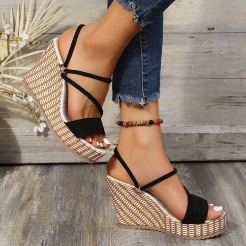 DE Sommer Damen Keilabsatz Peep Toe Sandalen Slingback Pumps Plateau Hausschuhe