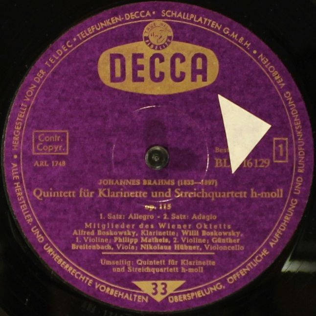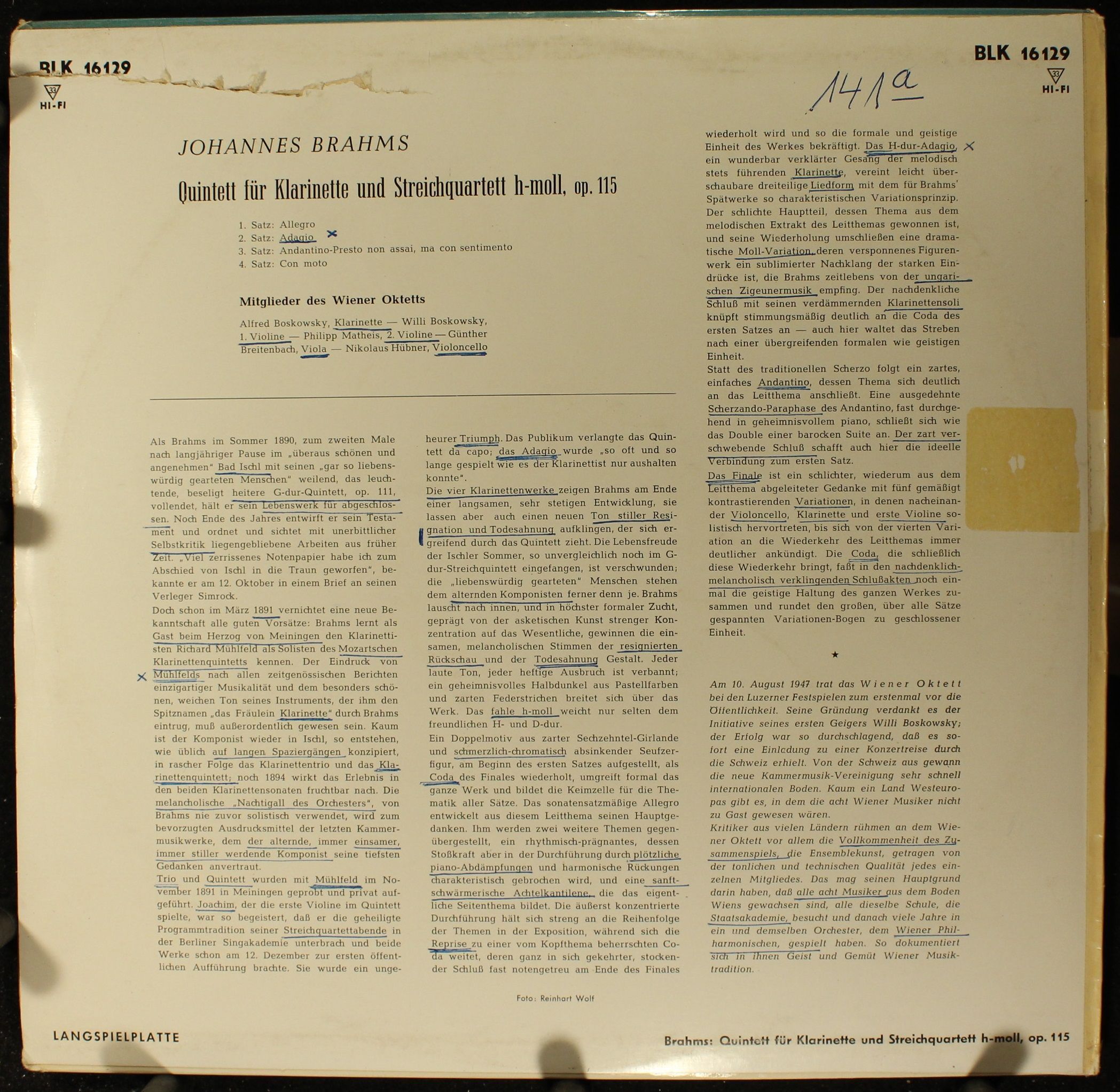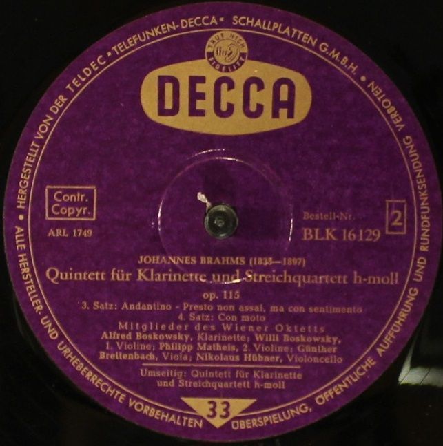 DECCA BLK 16129 - Johannes Brahms, Mitglieder Des Wiener Oktetts - Quintett Für