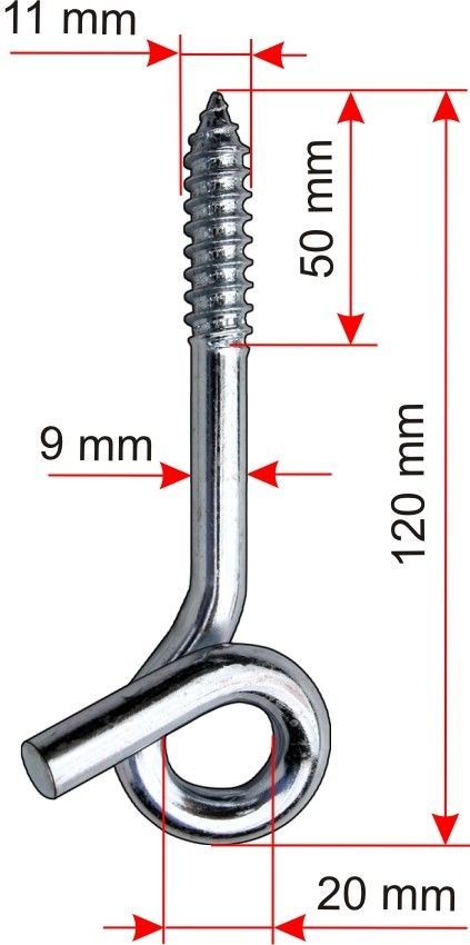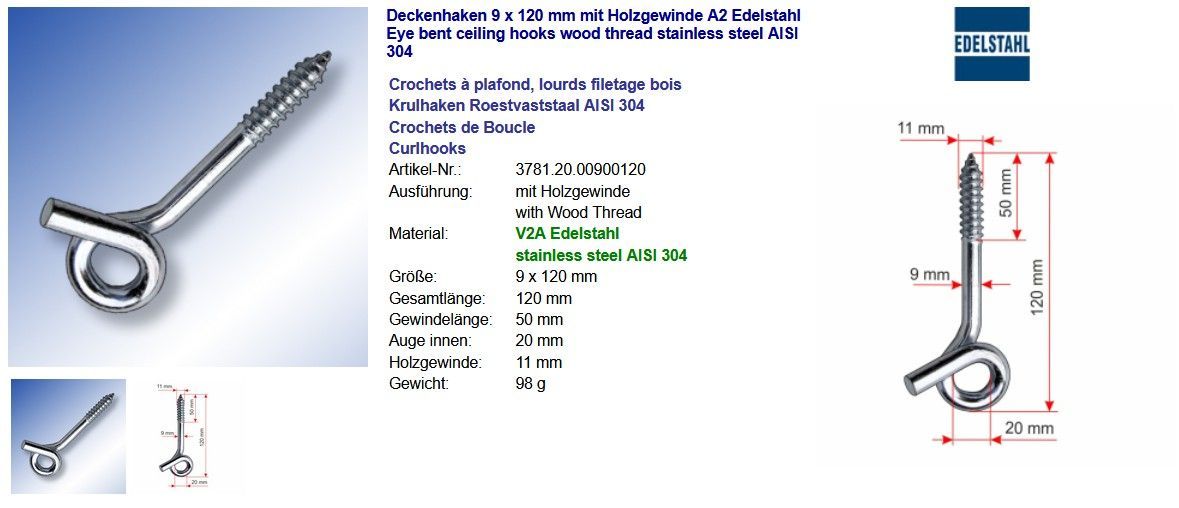 Deckenhaken 9 x 120 mm mit Holzgewinde A2 Edelstahl