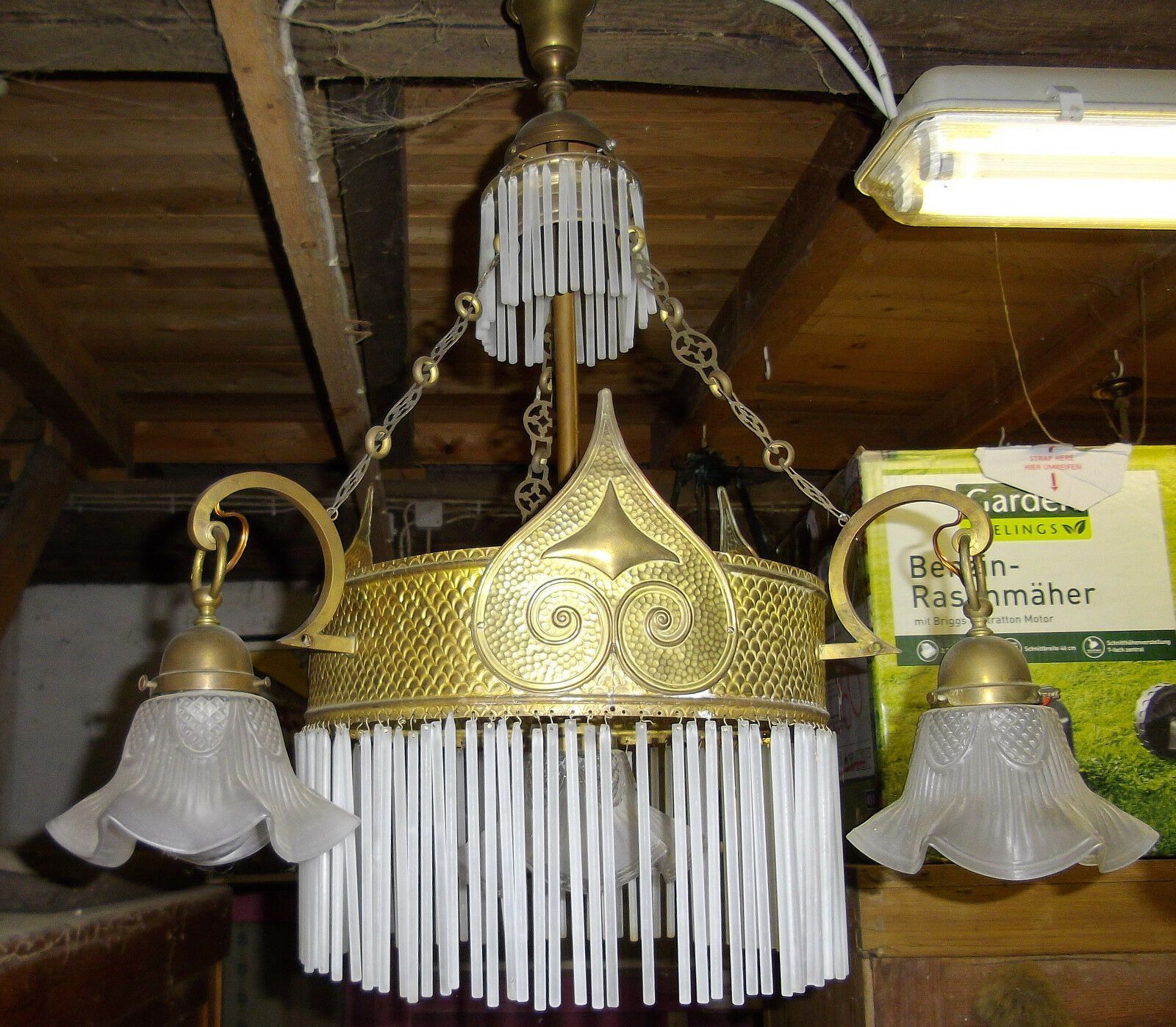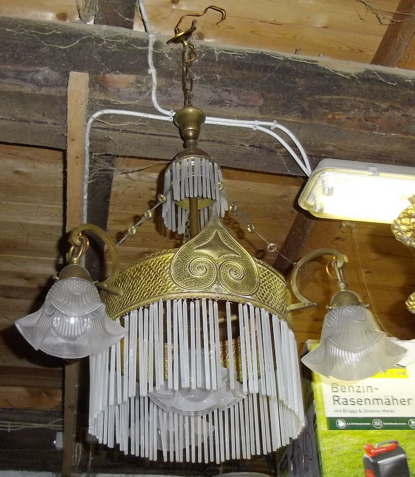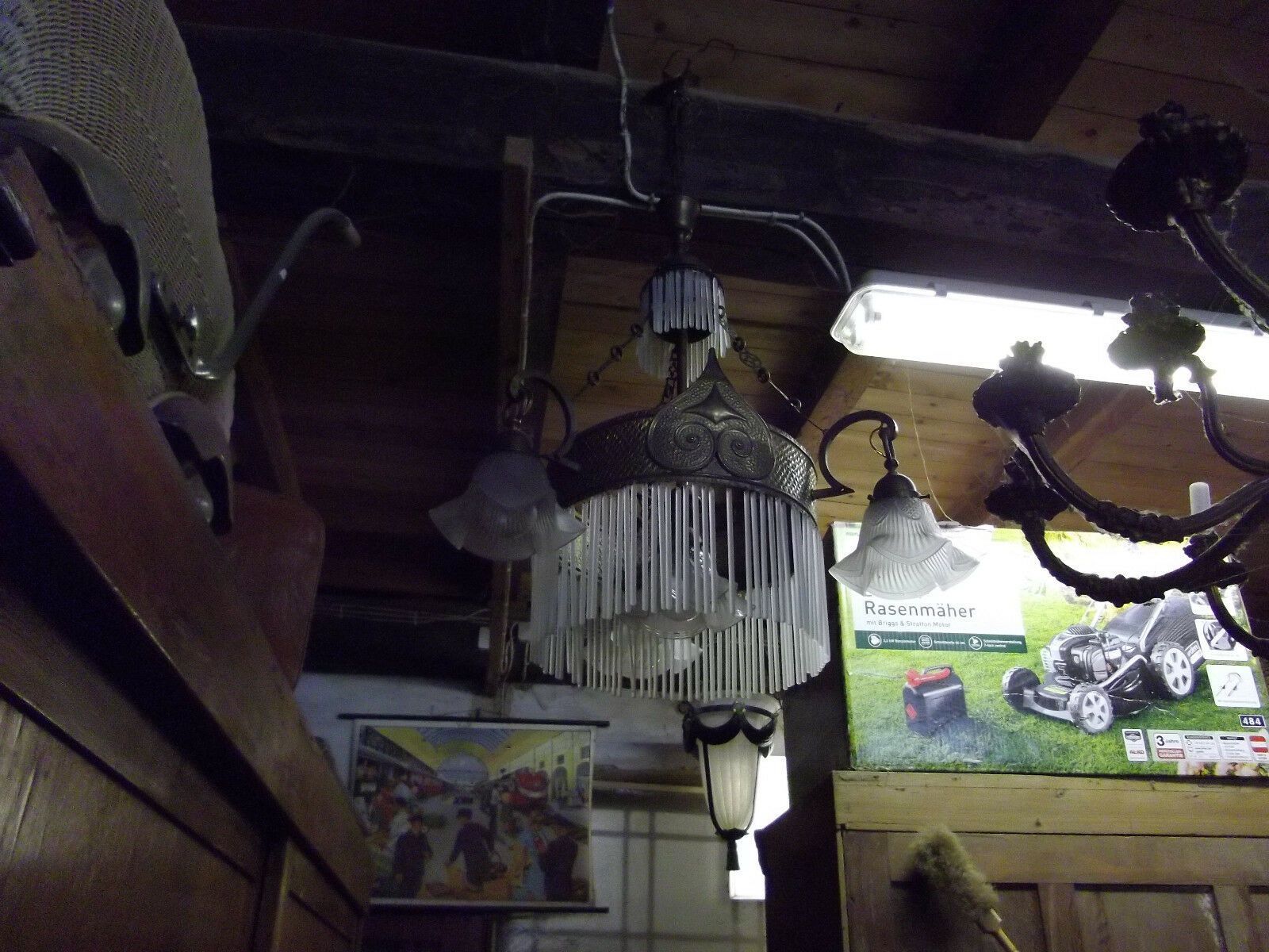 Deckenlampe um 1900 (Jugendstil). Material: Messing. Diese schöne Lampe besteht aus einem Ring aus Glasstäben, um den sich drei Einzelschirme gruppieren, und in deren Mitte ebenfalls ein Einzelschirm hängt. Alle Teile original. Nur einige sehr wenige Glasstäbe fehlen. Maße: H 110, Ring-Ø 35 c