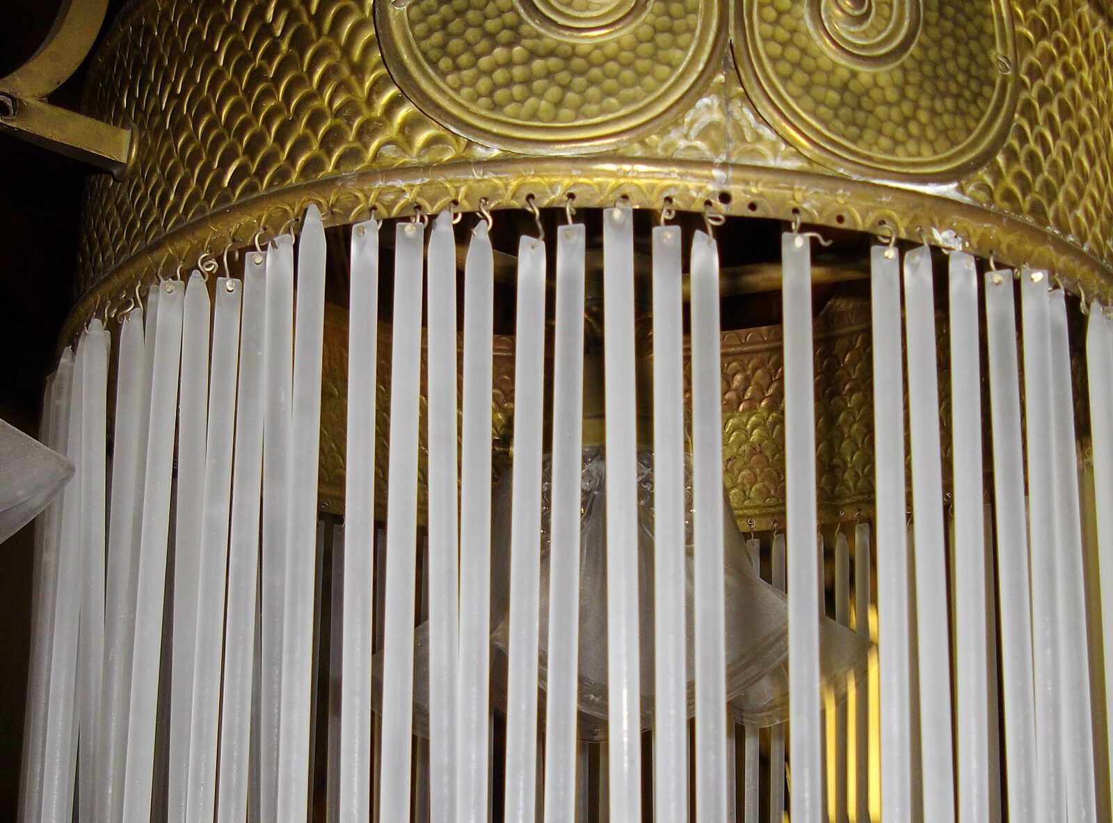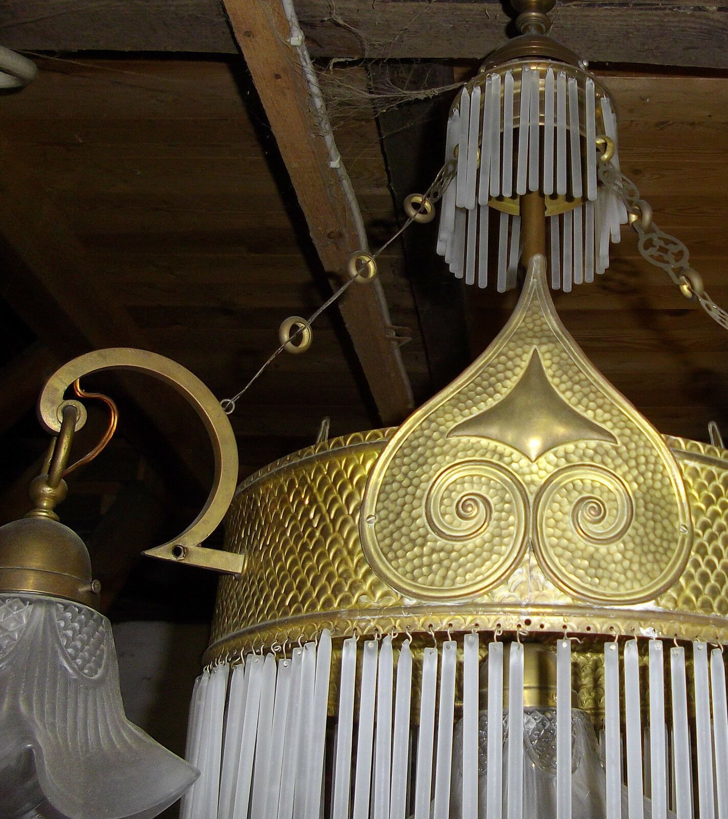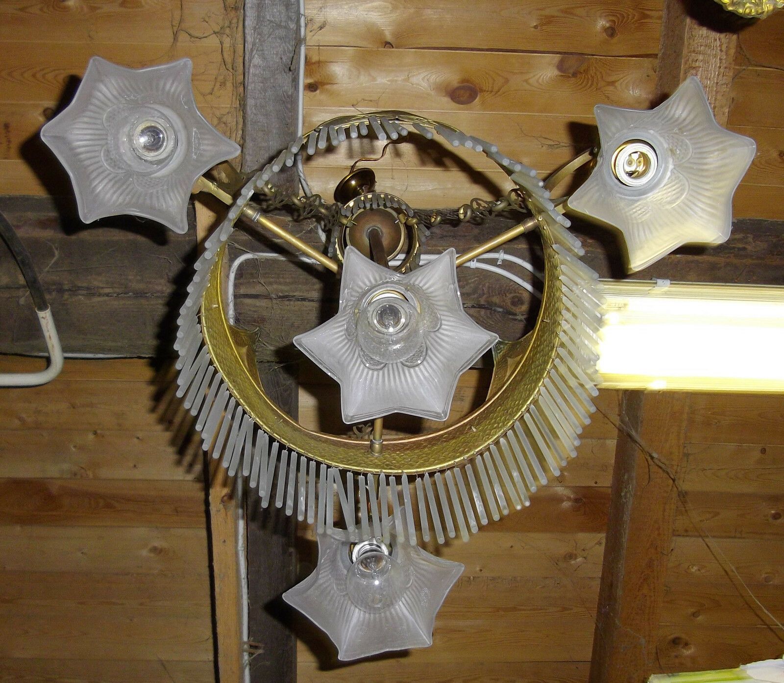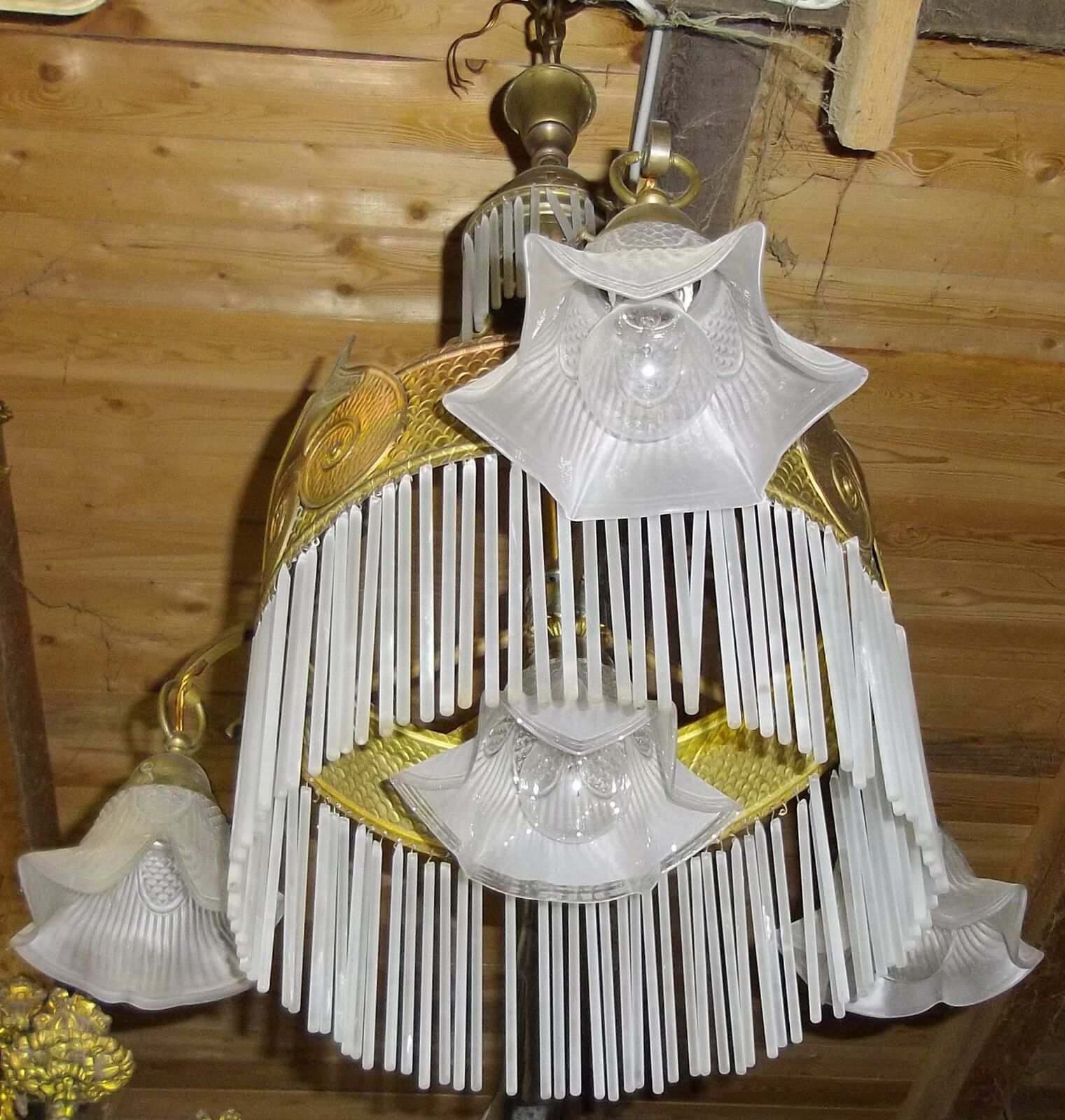 Deckenlampe um 1900 (Jugendstil). Material: Messing. Diese schöne Lampe besteht aus einem Ring aus Glasstäben, um den sich drei Einzelschirme gruppieren, und in deren Mitte ebenfalls ein Einzelschirm hängt. Alle Teile original. Nur einige sehr wenige Glasstäbe fehlen. Maße: H 110, Ring-Ø 35 c