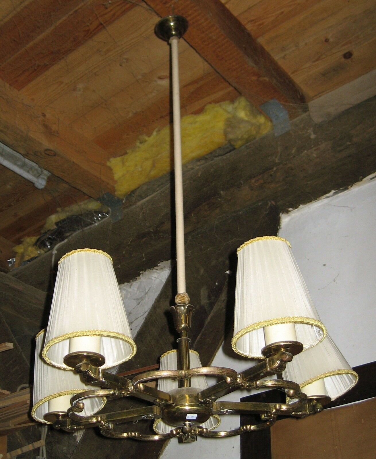 Deckenlampe um 1920. Material: Messing. Die Lampenschirme sind späteren Datums und können leicht entfernt werden. Maße: H 105, Ø 65 cm. Antikes am Deich - Inh: Oliver Kipp-Trense