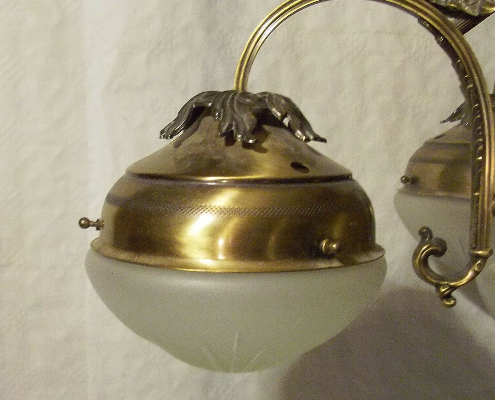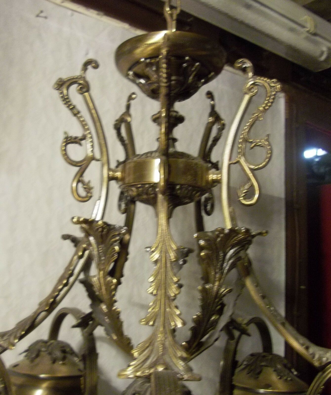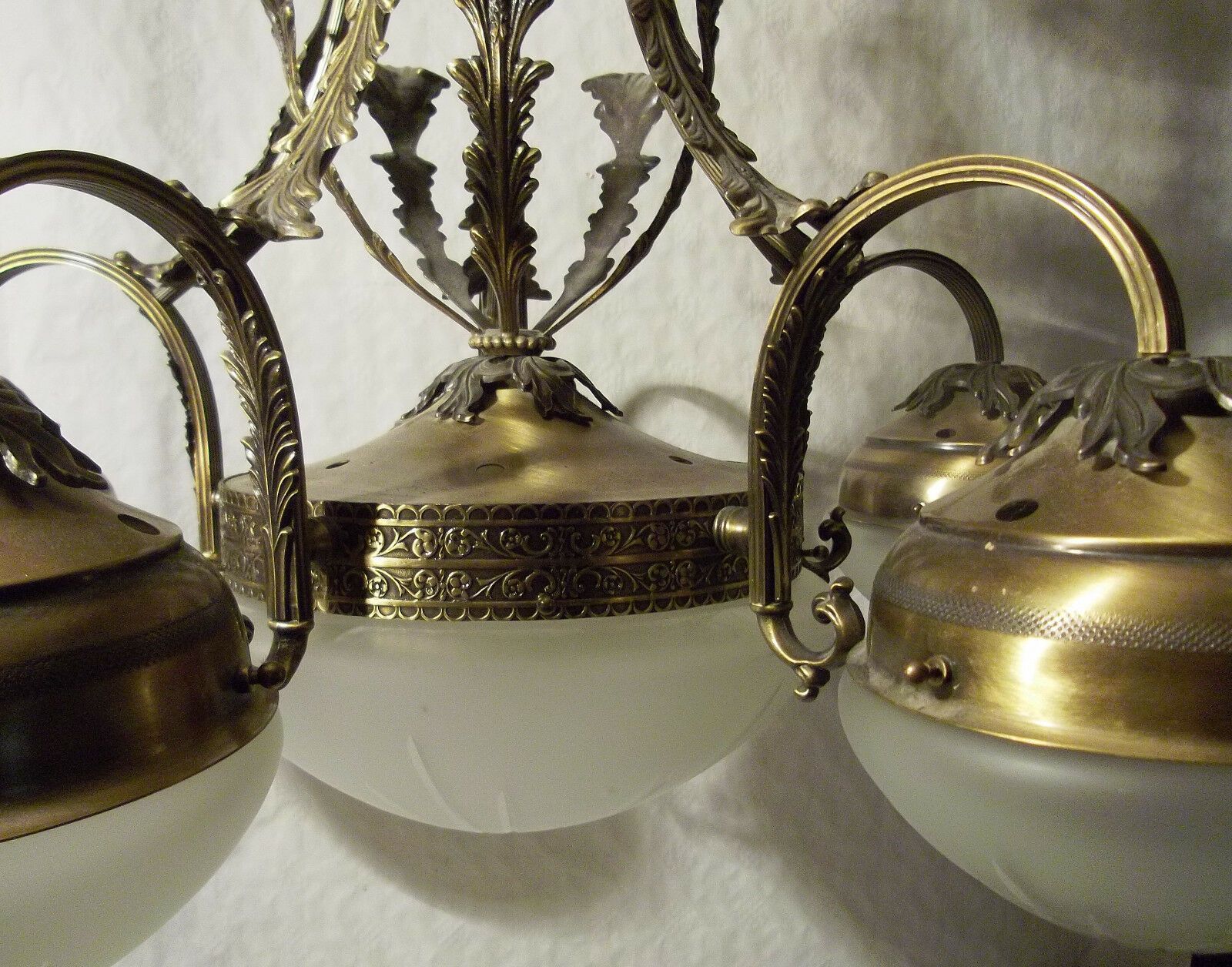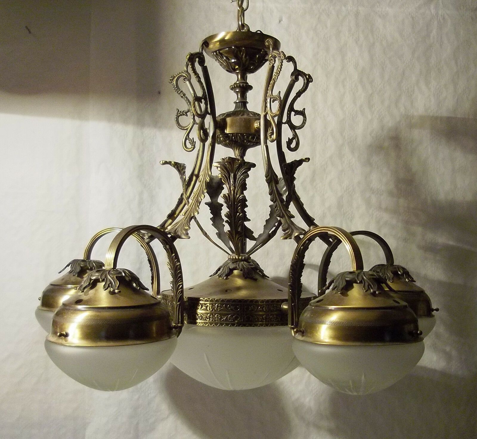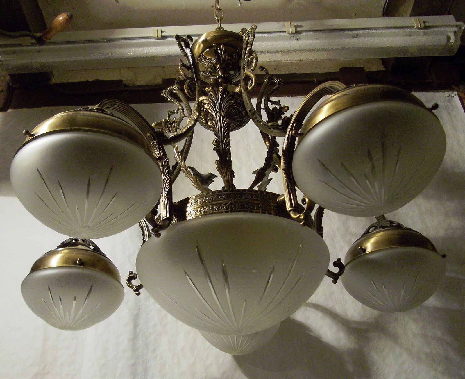 Deckenlampe um 1975 im Stil der Gründerjahre. Material: Messing Glas. Diese Lampe ist eine Replik der Firma Medusa Hamburg aus den 70er Jahren und hat damals etwa DM 1600,00 gekostet. Schirme: 5 x 14, 1 x 24,5 cm Maße: H 60, Ø 70 cm; zusätzliche Kettenlänge 150 cm (also auch für sehr hohe Räu