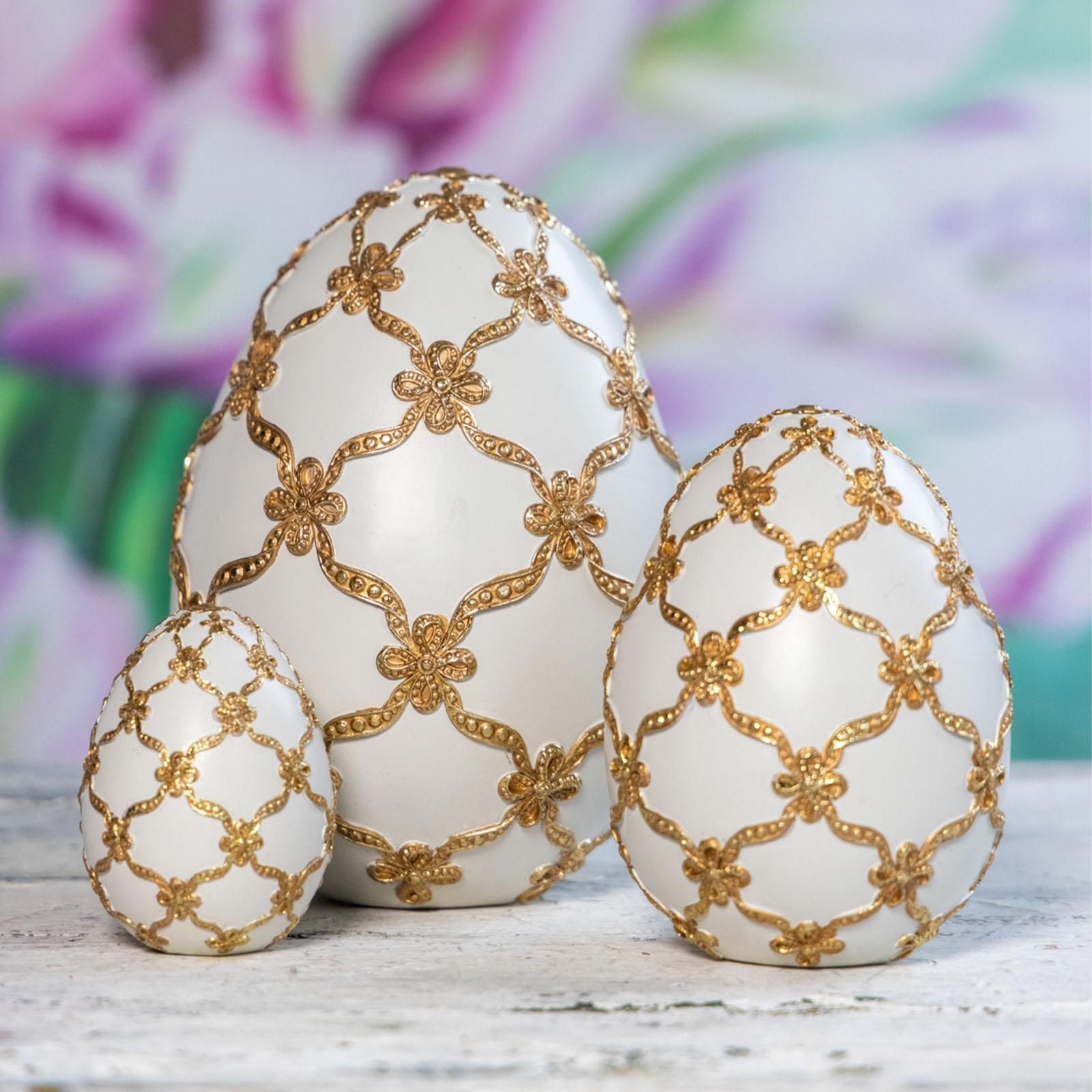 Deko-Ei 10 x Ø 7.5 cm Kunststein weiß Schleifen-Goldverzierung stehendes Osterei