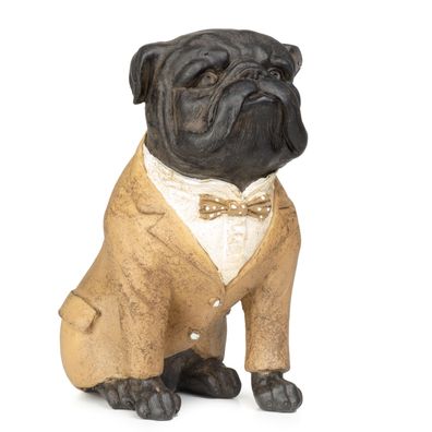 • Moritz Deko-Figur Mops Hund im beigen Anzug mit Fliege sitz aus Polyresin Dekorations