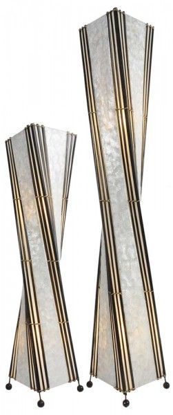 Asia-Lampe KOMANG , Duo aus weißen Capisscheiben mit schwarzen Bambusstreifen, 100 cm oder 150 cm hoch Geht im wahrsten Sinn des Wortes verschlungene Wege: Das Lampen-Duo verdankt den Kunsthandwerkern auf Bali sein ungewöhnliches Aussehen. Der Kontrast zwischen weißen Capis und den schwarz wirkenden