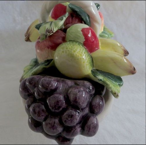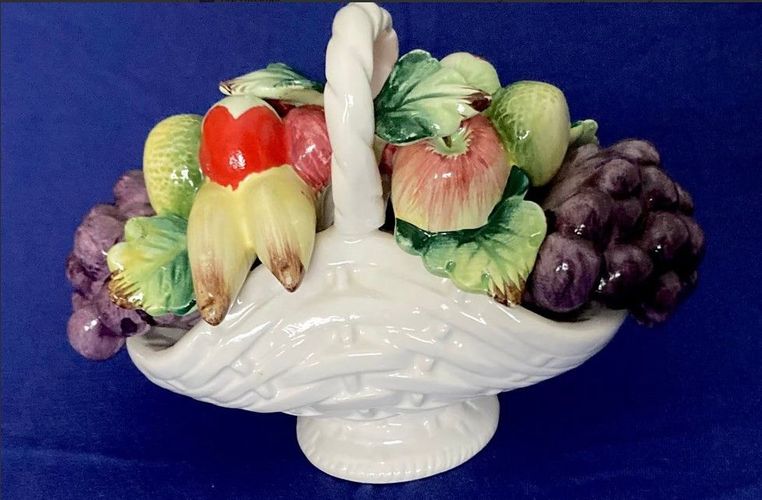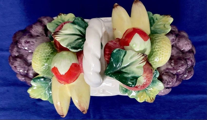 Vintage Obstkorb mit Zierfrüchten, Keramik, geflochten, handgefertigt und handbemalt, Neuwertig 17x13x11 cm BxHxT Wurde auch bei Ebay-Kleinanzeige eingestellt ( 3170197420 ) Handgefertigt und handbemalte Keramik. Aufwendige Zierkeramik bzw. Tafelaufsatz mit farbenprächtiger Glasur Nicht das Passende
