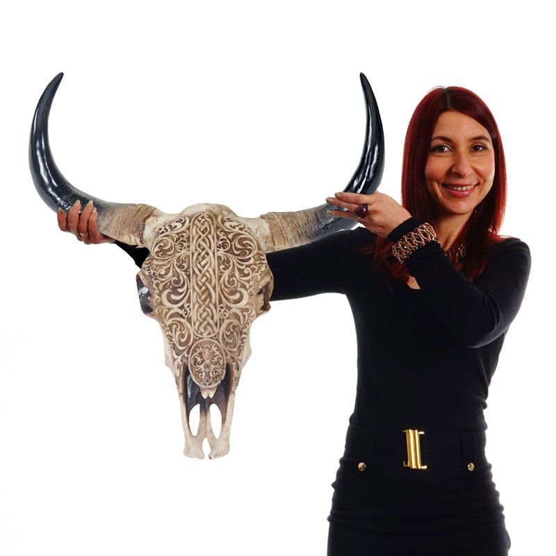 Mendler Deko Schädel 65cm MDC-T454, Polyresin Bulle Longhorn Trophäe mit Tribal, In-/Outdoor