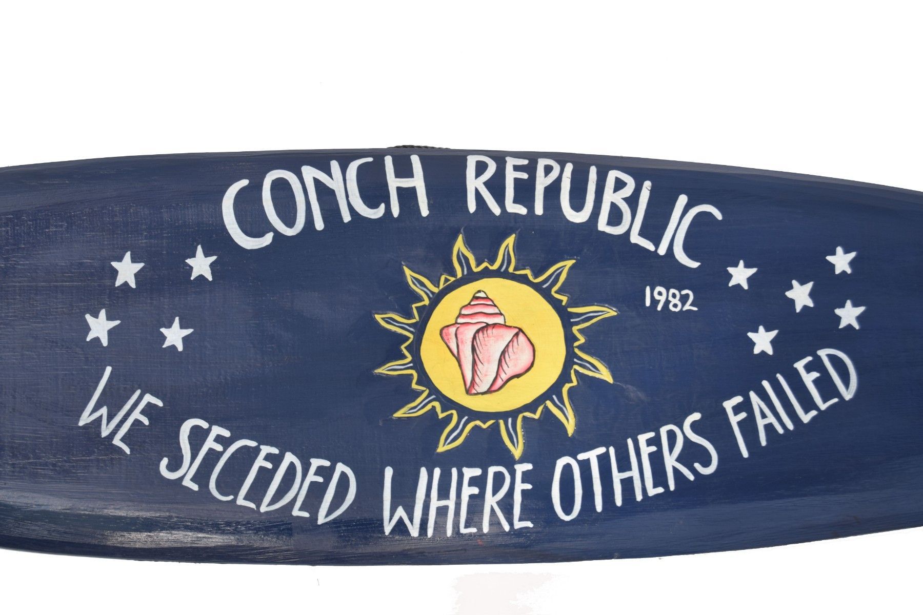 Deko Surfbrett aus Holz - Mit Vorrichtung zum Aufhängen - Länge: ca. 100cm - Text: "Conch Republic" - die Schrift ist erhaben/herausgearbeitet - in Handarbeit gefertigt / Handbemalt - Rückseite schwarz