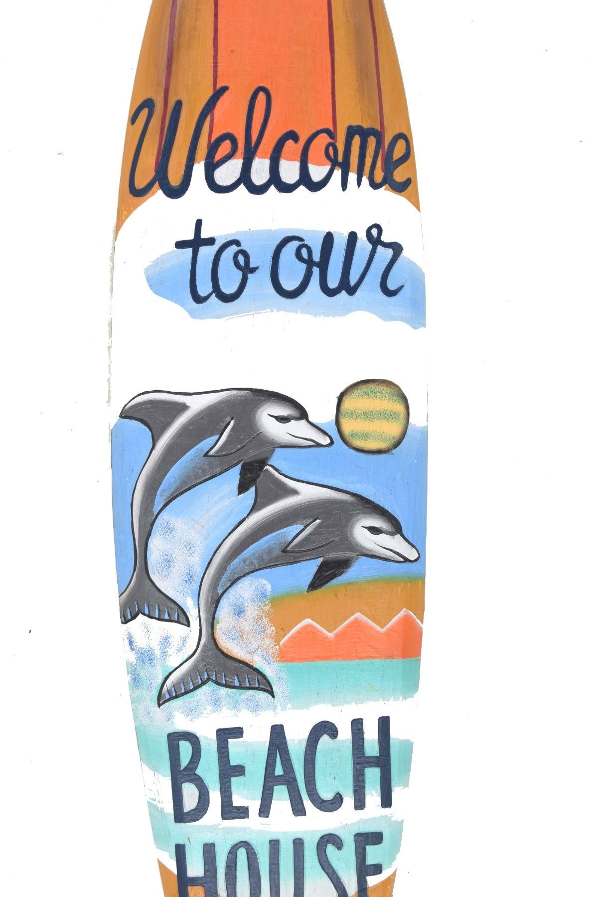 Deko Surfbrett aus Holz - Mit Vorrichtung zum Aufhängen - Länge: ca. 100cm - Text: "Welcome To our Beach House" - die Schrift ist erhaben/herausgearbeitet - in Handarbeit gefertigt / Handbemalt - Rückseite schwarz