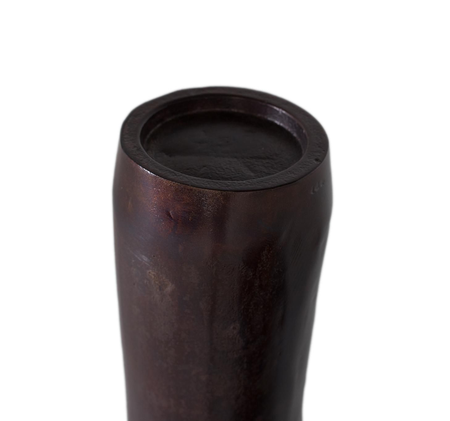 Dekorative Figur aus Aluminium mit gealterter Bronzeoberfläche. Ihr abstraktes Design zeichnet sich durch organische Linien und eine skulpturale Erscheinung aus. Das Stéck ruht auf einem breiten, konischen Sockel, der ihm Stabilität verleiht und seine Präsenz verstärkt. Es ist ein einzigartiges und