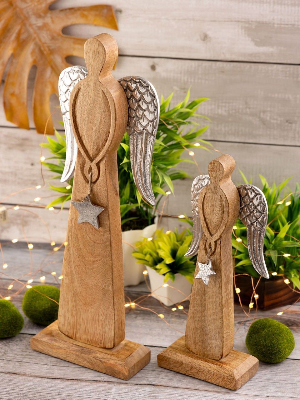 Dekofigur Engel 2er Set 12/16x32/47cm Weihnachtsdeko Aufsteller Mangoholz Aluminium