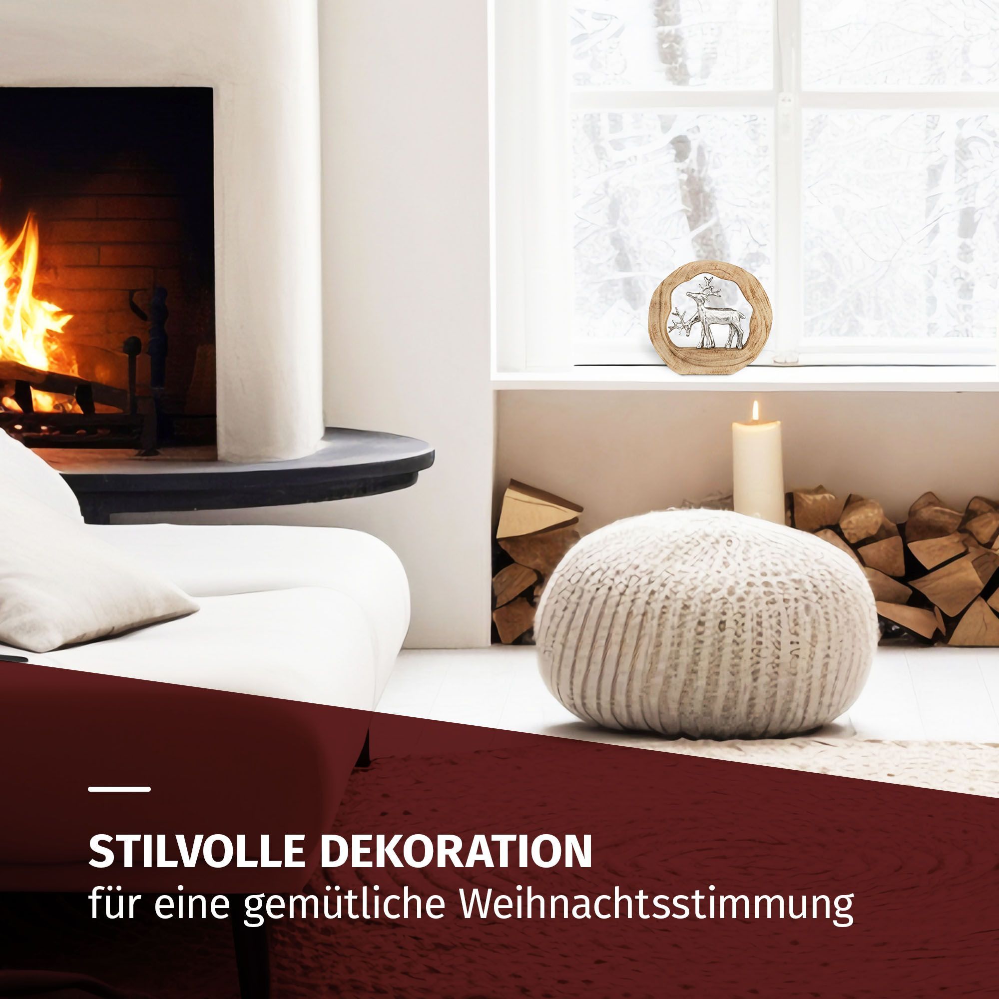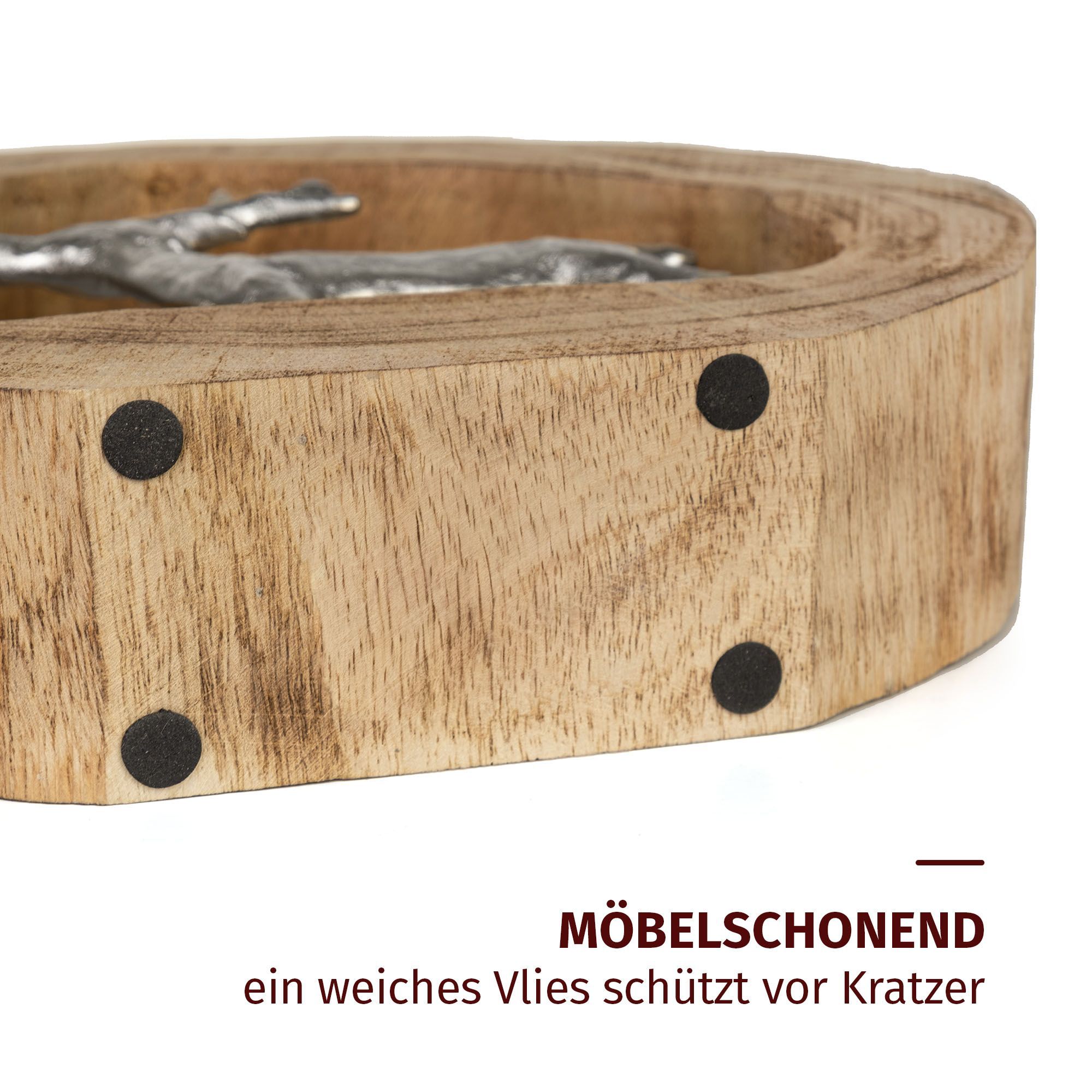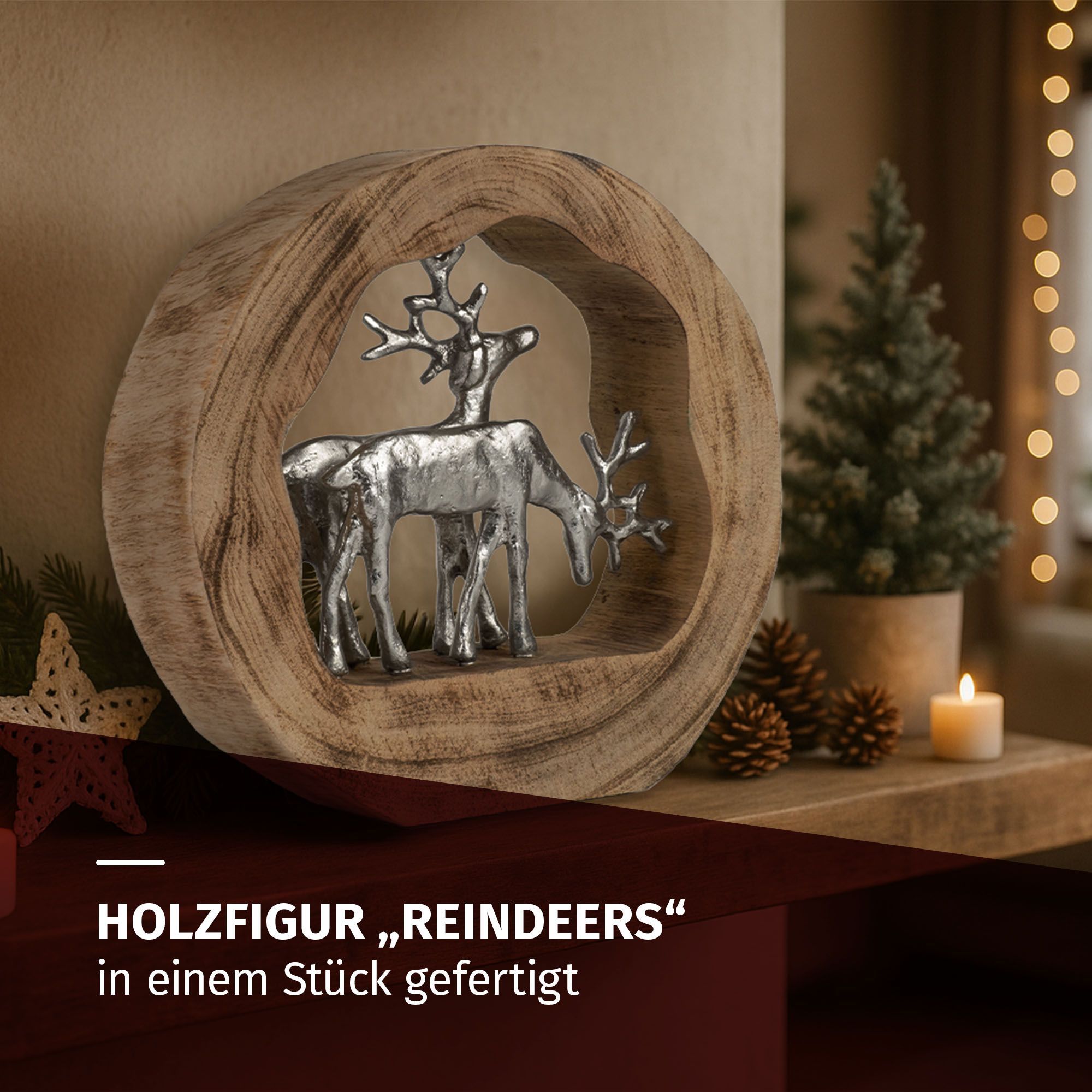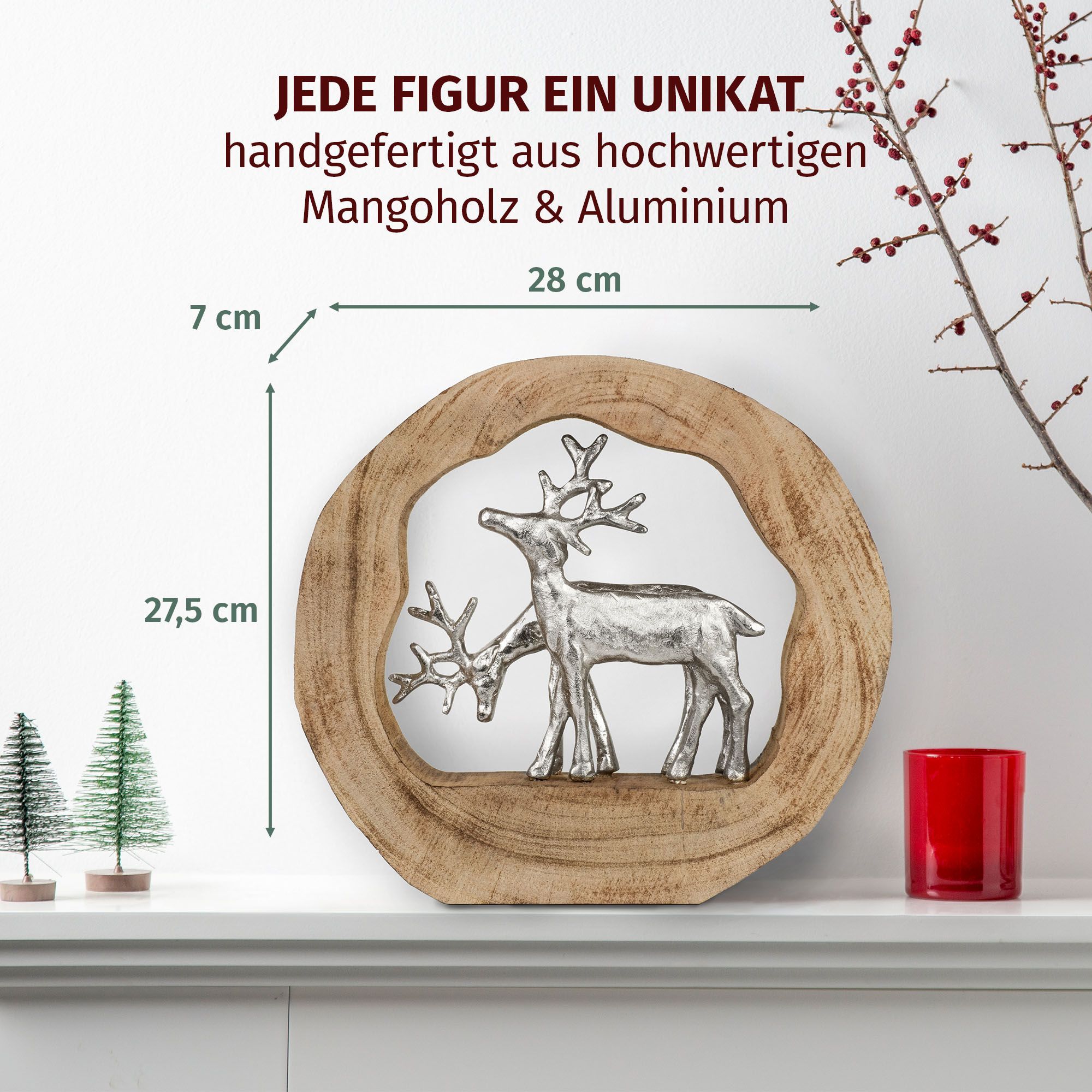 Dekofigur Rentiere im Holzring aus Mangoholz Aluminium Holzskulptur 27,5 cm