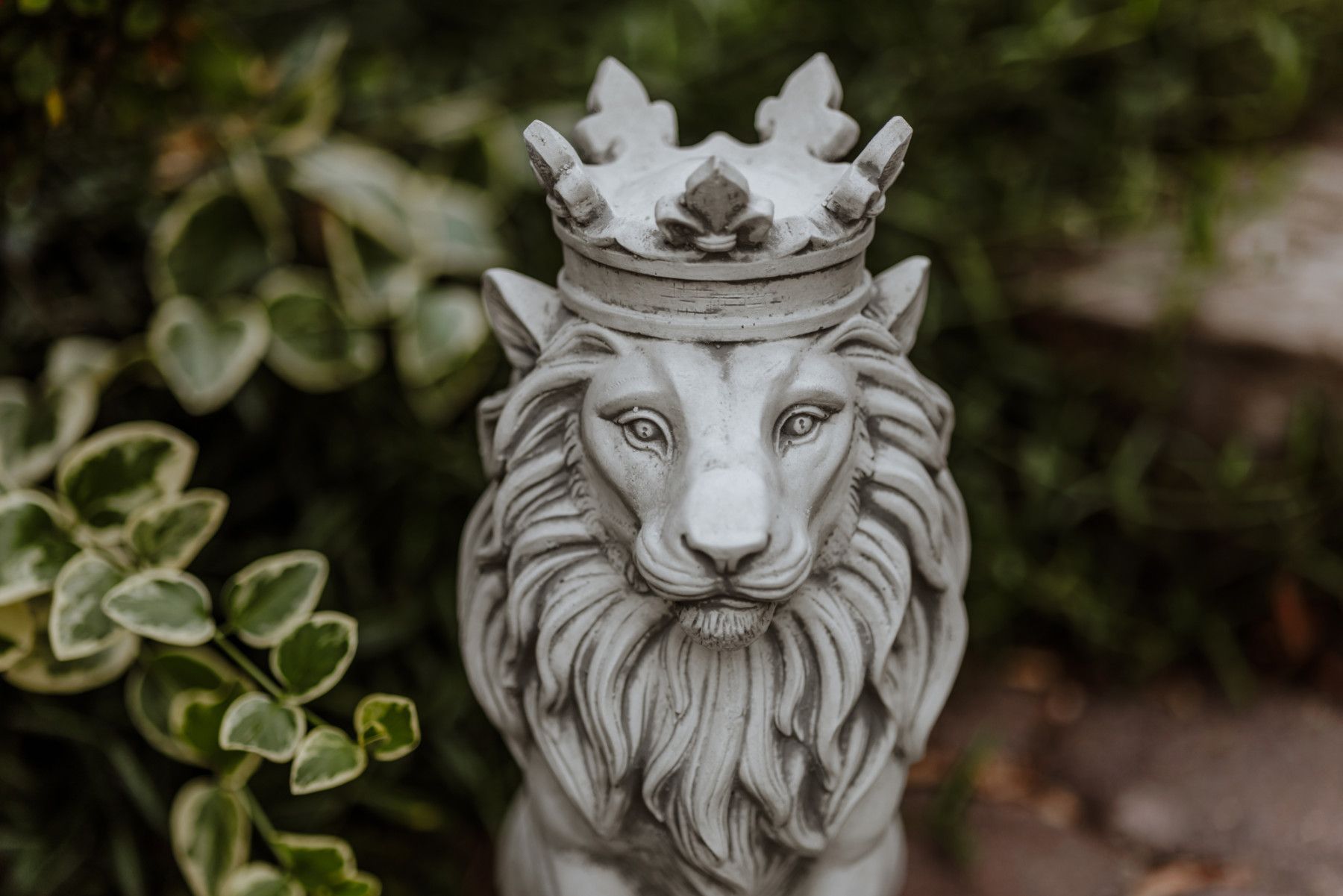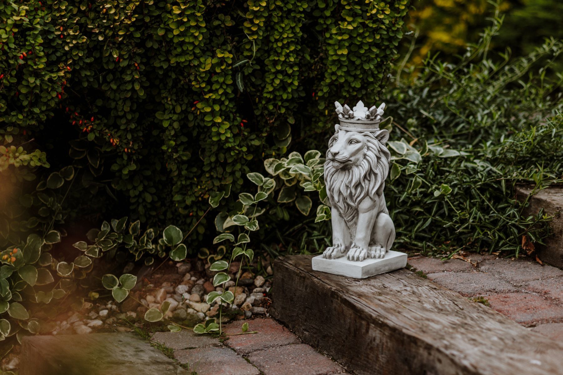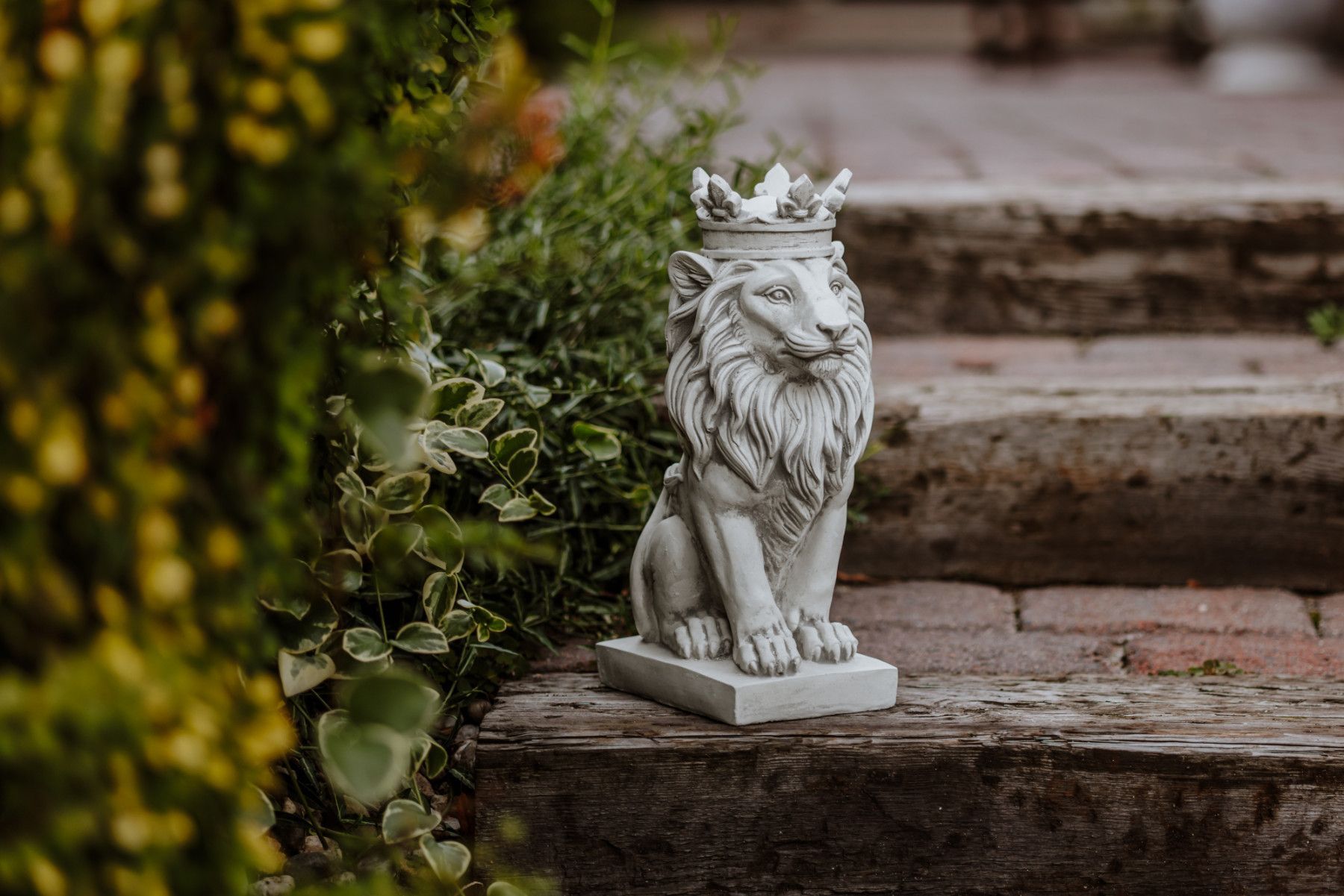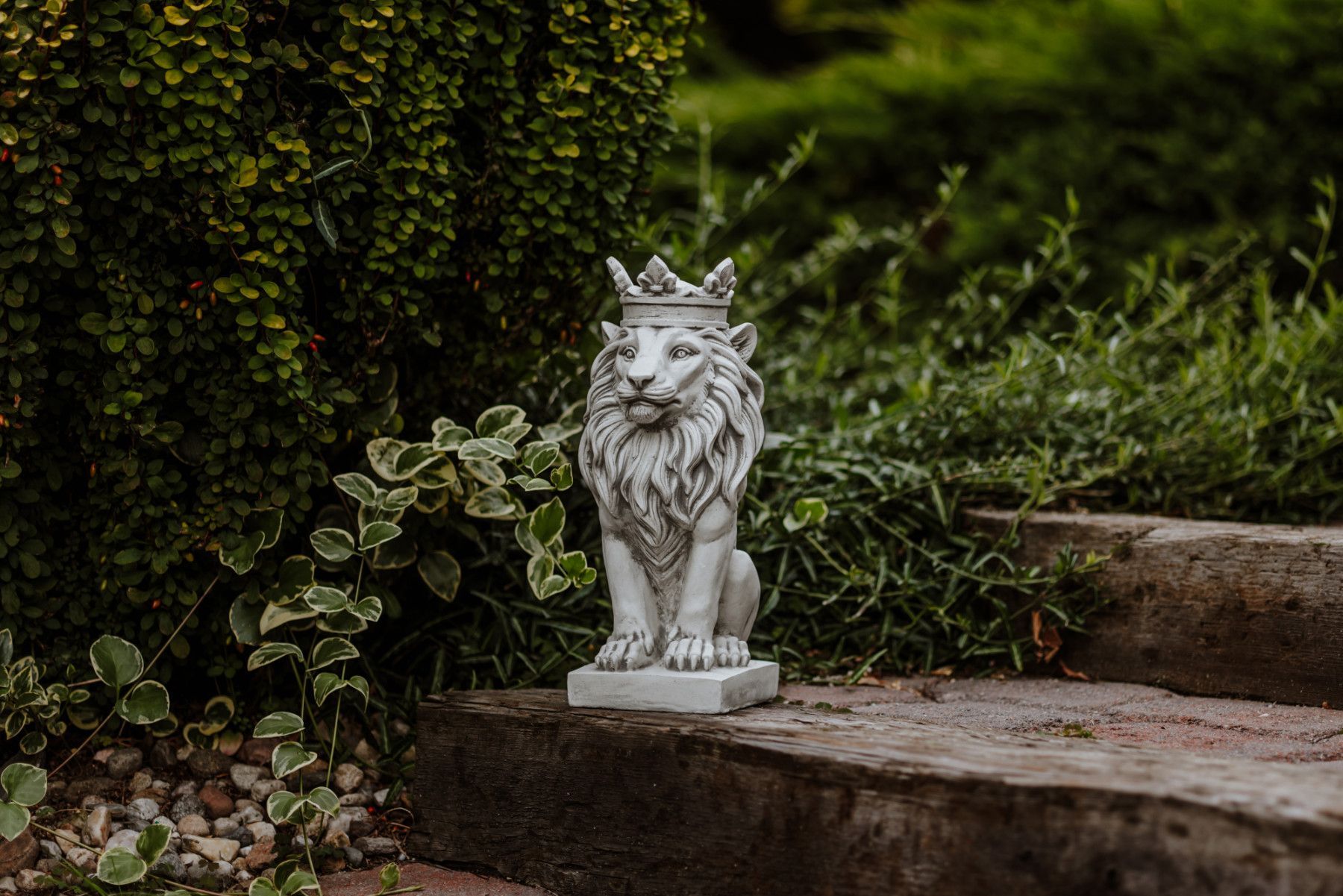 Dekorative Löwenfigur mit Krone, Löwe Steinfigur, Steinguss, 36 cm Höhe, 9 kg