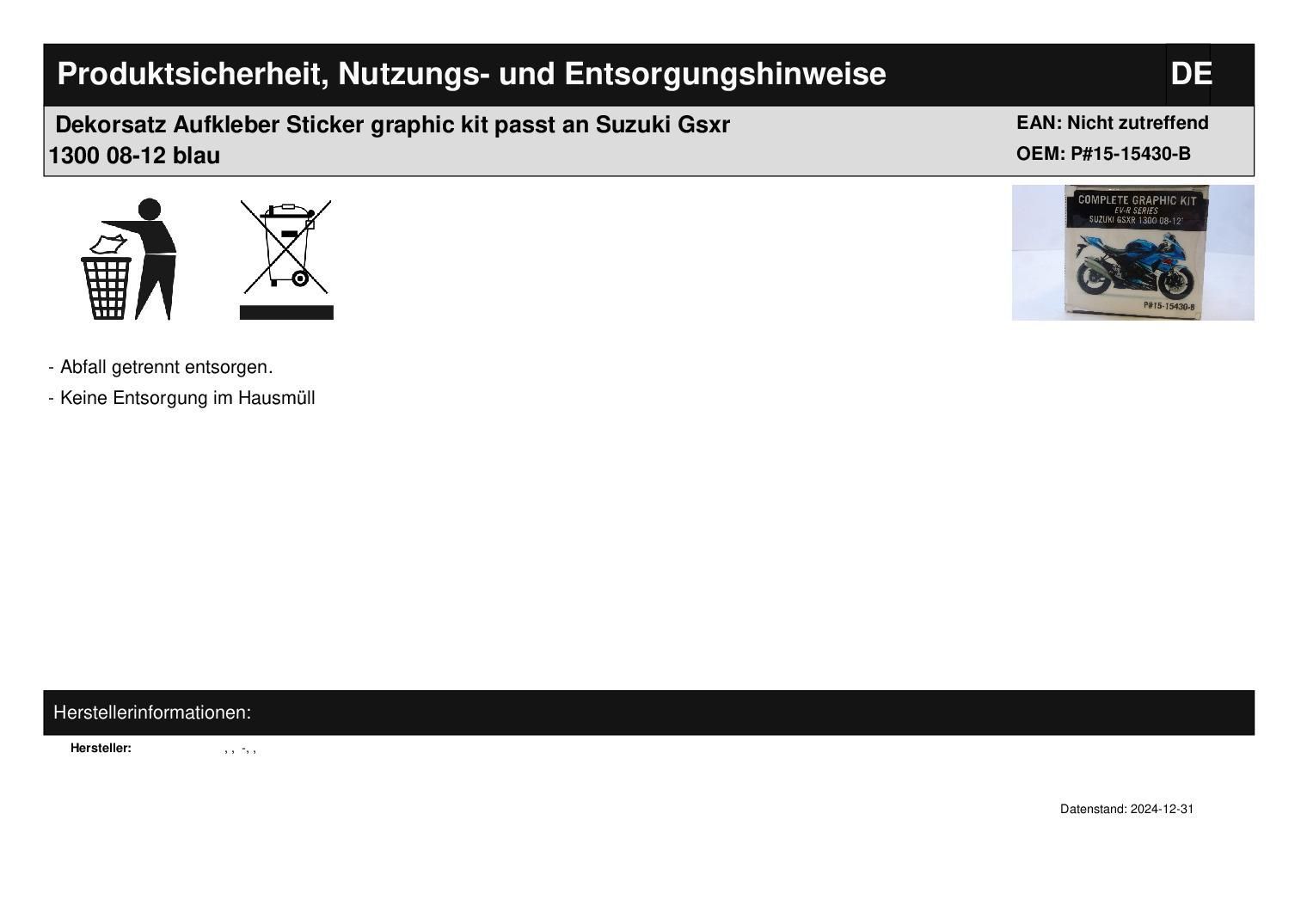 Dekorsatz Aufkleber Sticker graphic kit passt an Suzuki Gsxr 1300 08-12 blau In dieser Auktion gibt es folgenden Artikel zu kaufen: Dekorsatz (siehe Foto) Modell: passend für Suzuki GSXR 1300 Bj.: 08 - 12 Lieferumfang: siehe Foto Artikelzustand: neu aus Geschäftsauflösung, mit leichten Lagerspuren;