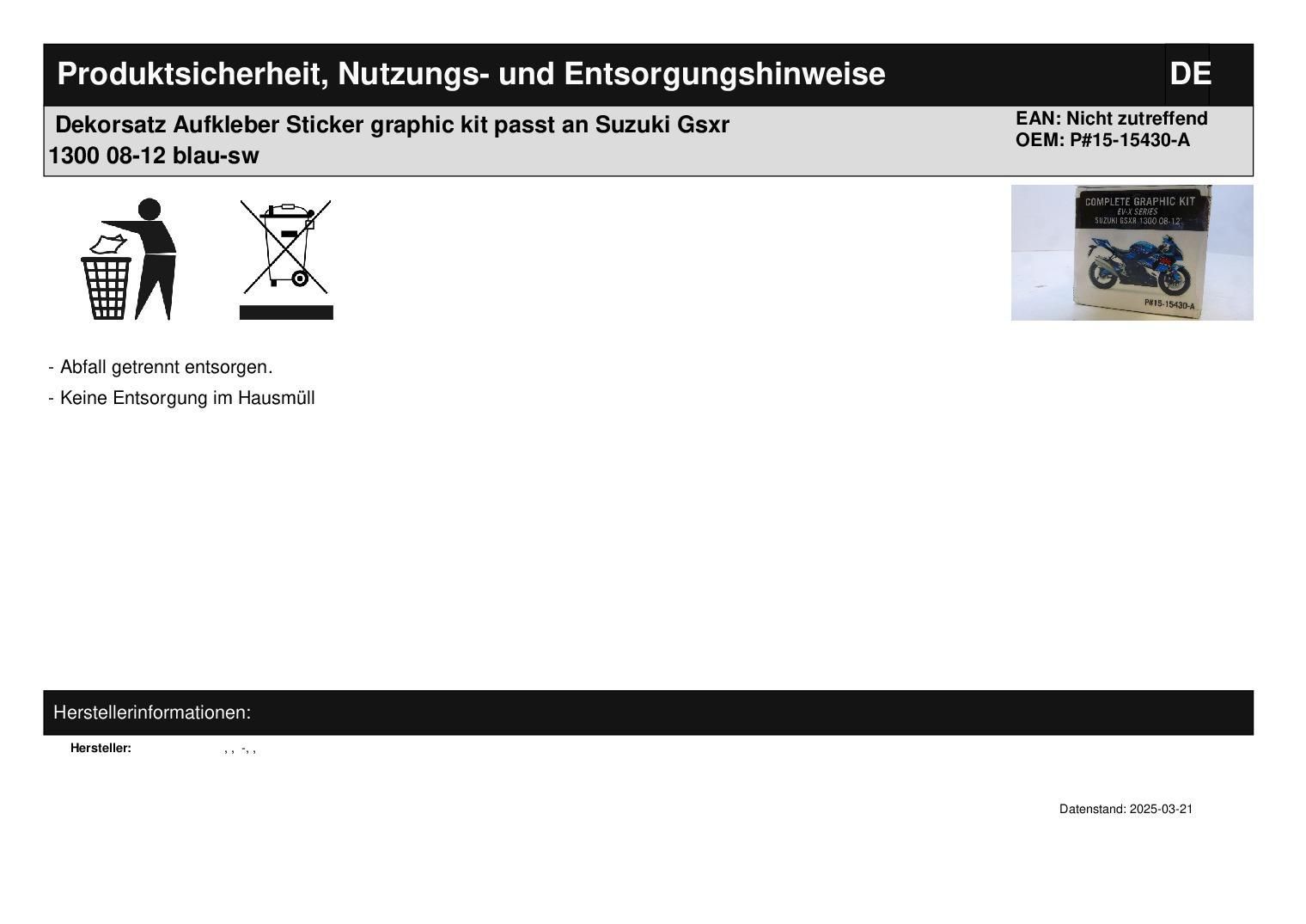 Dekorsatz Aufkleber Sticker graphic kit passt an Suzuki Gsxr 1300 08-12 blau-sw