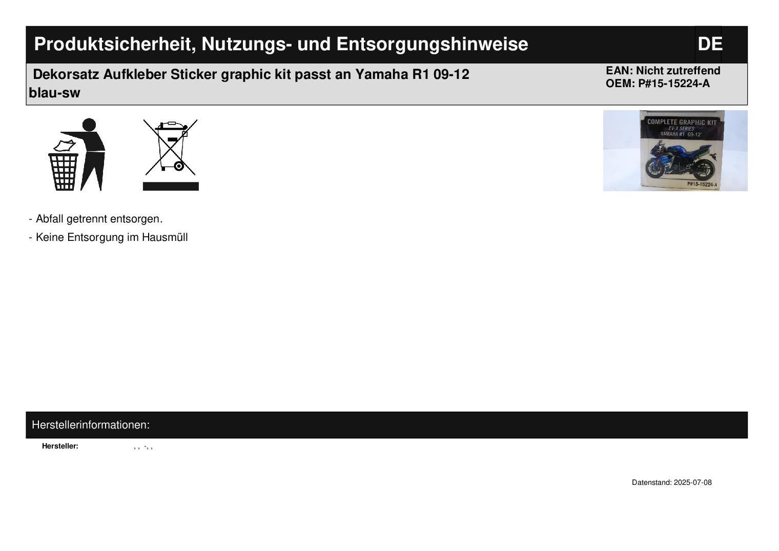 Dekorsatz Aufkleber Sticker graphic kit passt an Yamaha R1 09-12 blau-sw In dieser Auktion gibt es folgenden Artikel zu kaufen: Dekorsatz (siehe Foto) Modell: passend für Yamaha R1 Bj.: 09 - 12 Lieferumfang: siehe Foto Artikelzustand: neu aus Geschäftsauflösung, mit leichten Lagerspuren; Dekor wird