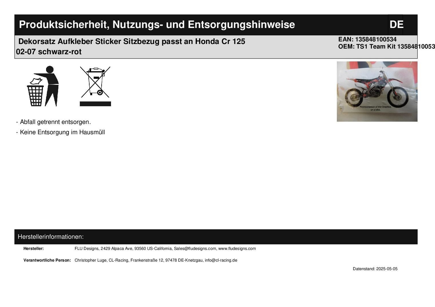 Dekorsatz Aufkleber Sticker Sitzbezug passt an Honda Cr 125 02-07 schwarz-rot