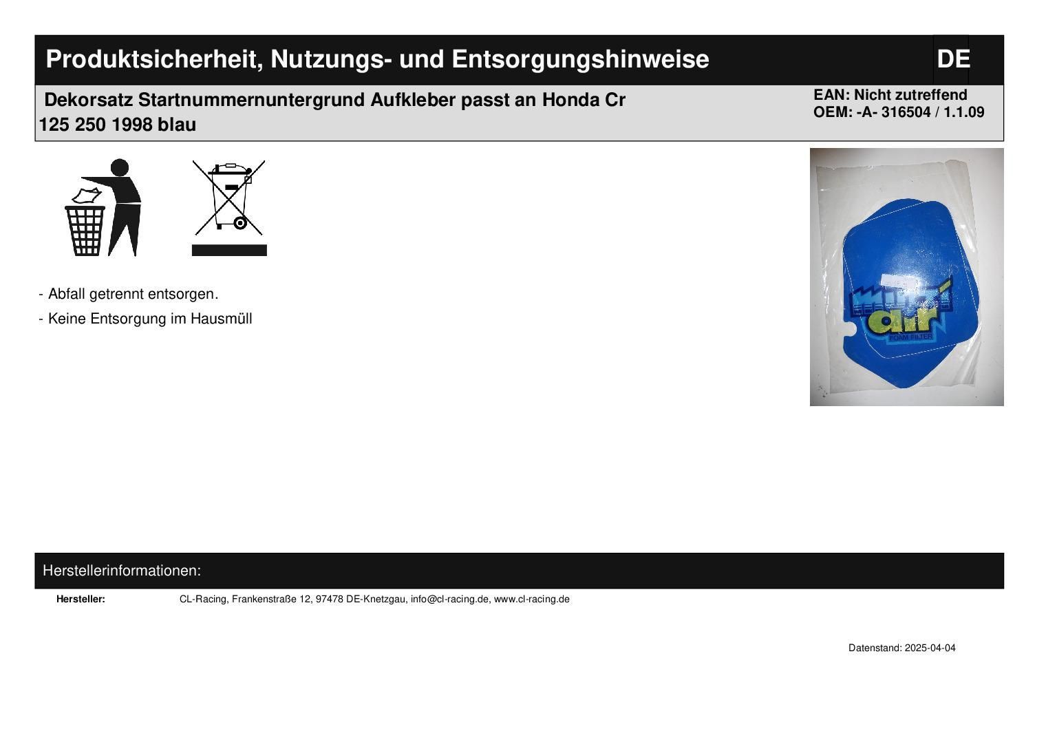 Dekorsatz Startnummernuntergrund Aufkleber passt an Honda Cr 125 250 1998 blau In dieser Auktion gibt es folgenden Artikel zu kaufen: Dekorsatz (siehe Foto) Modell: passend für Honda CR125 Bj.: 98 CR 250 Bj.: 97 - 98 Lieferumfang: siehe Foto Es werden nur die Aufkleber geliefert, die auf dem Foto zu
