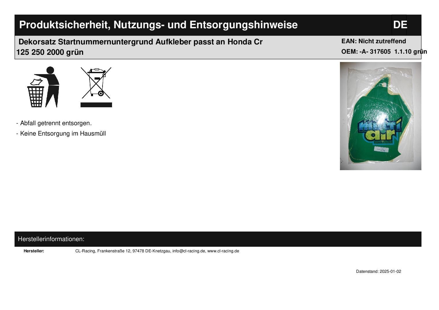 Dekorsatz Startnummernuntergrund Aufkleber passt an Honda Cr 125 250 2000 grün