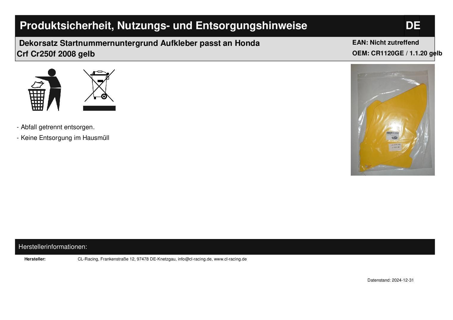 Dekorsatz Startnummernuntergrund Aufkleber passt an Honda Crf Cr250f 2008 gelb