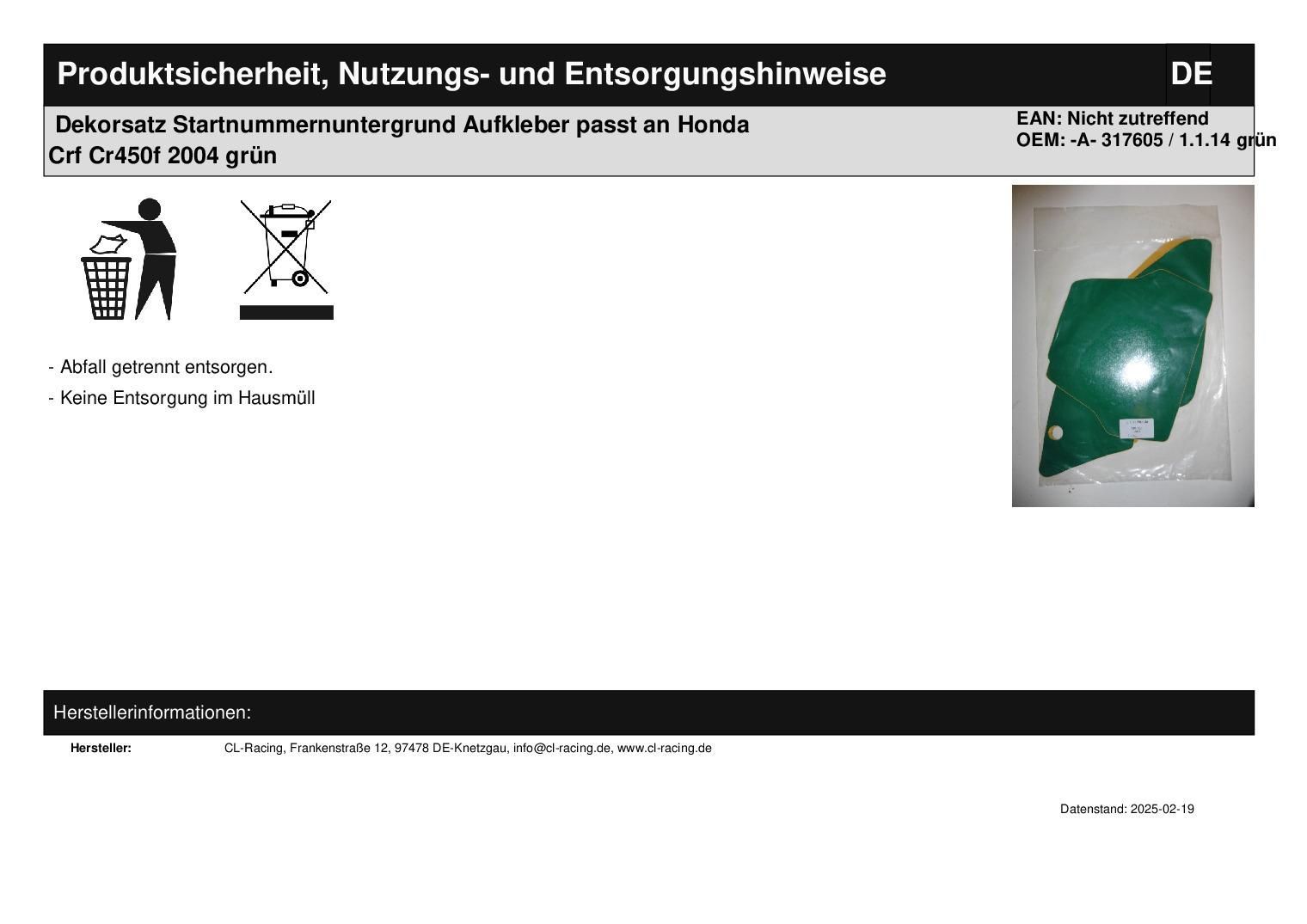 Dekorsatz Startnummernuntergrund Aufkleber passt an Honda Crf Cr450f 2004 grün