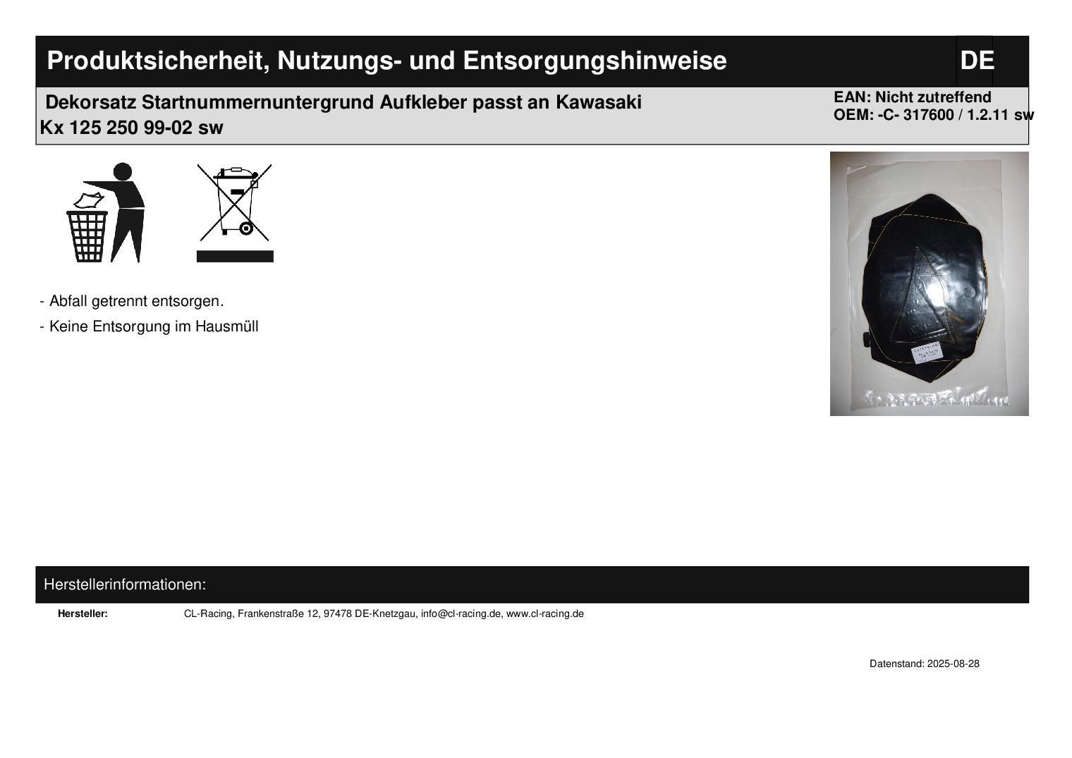 Dekorsatz Startnummernuntergrund Aufkleber passt an Kawasaki Kx 125 250 99-02 sw In dieser Auktion gibt es folgenden Artikel zu kaufen: Dekorsatz (siehe Foto) Modell: passend für Kawasaki KX 125, 250 Bj.: 99 - 02 Lieferumfang: siehe Foto Es werden nur die Aufkleber geliefert, die auf dem Foto zu seh