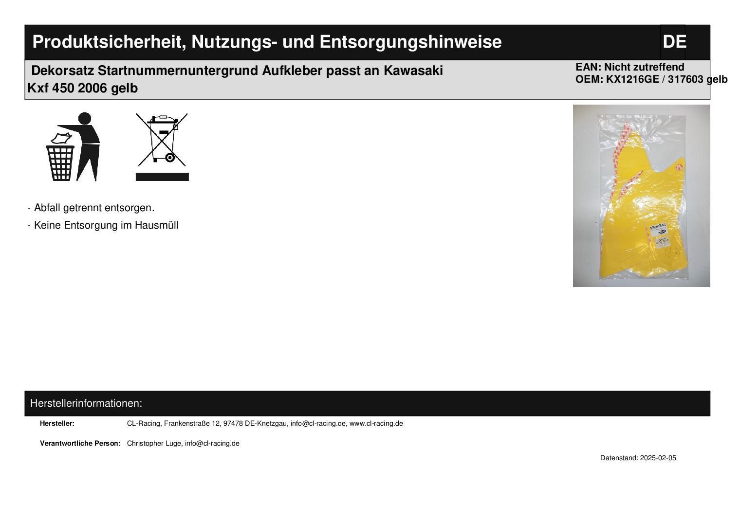 Dekorsatz Startnummernuntergrund Aufkleber passt an Kawasaki Kxf 450 2006 gelb In dieser Auktion gibt es folgenden Artikel zu kaufen: Dekorsatz (siehe Foto) Modell: passend für Kawasaki KXF 450 Bj.: 06 Lieferumfang: siehe Foto Es werden nur die Aufkleber geliefert, die auf dem Foto zu sehen sind. Ar