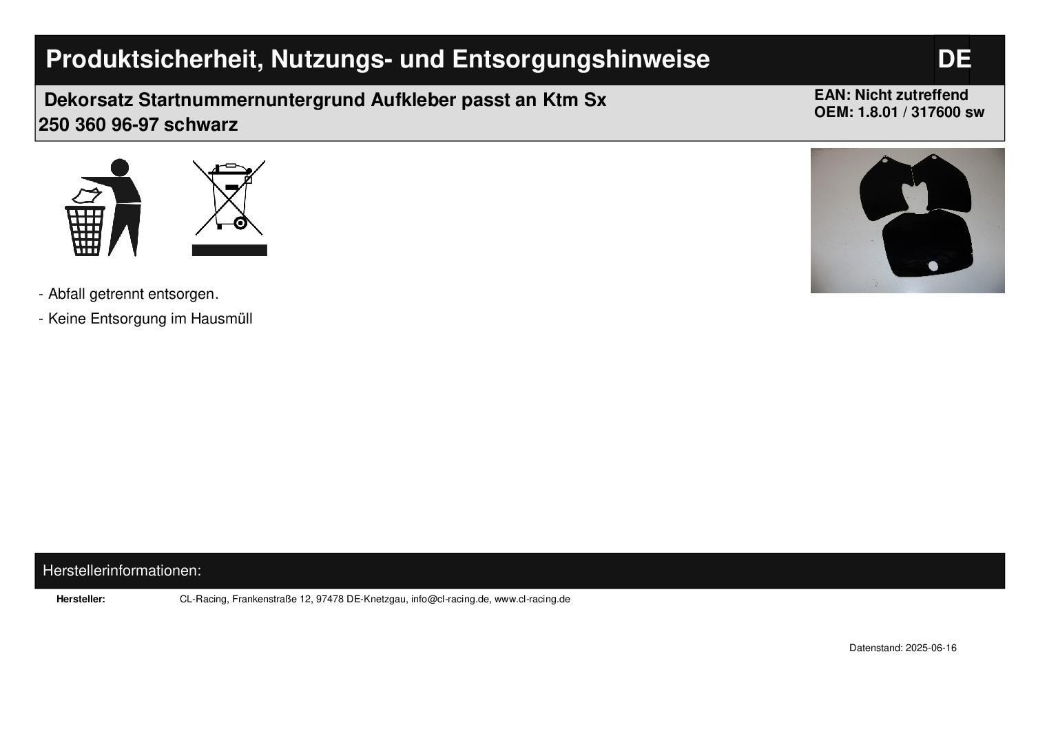 Dekorsatz Startnummernuntergrund Aufkleber passt an Ktm Sx 250 360 96-97 schwarz In dieser Auktion gibt es folgenden Artikel zu kaufen: Dekorsatz (siehe Foto) Modell: passend für Ktm SX 250, 360 Bj.: 96 - 97 Lieferumfang: siehe Foto Es werden nur die Aufkleber geliefert, die auf dem Foto zu sehen si