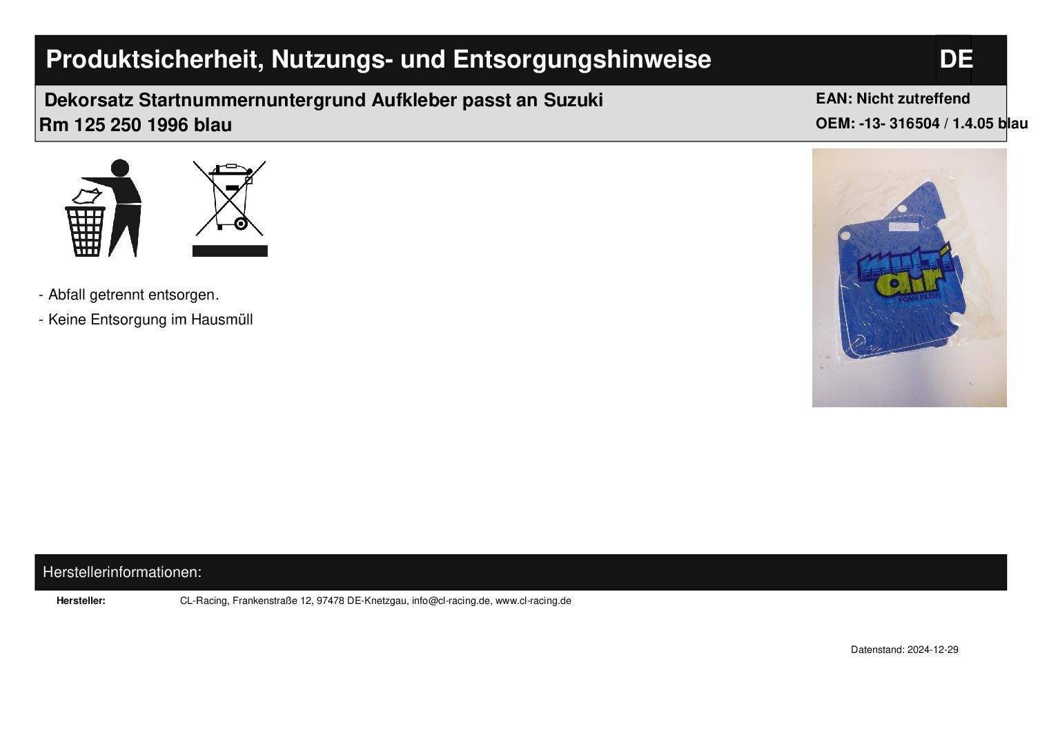 Dekorsatz Startnummernuntergrund Aufkleber passt an Suzuki Rm 125 250 1996 blau In dieser Auktion gibt es folgenden Artikel zu kaufen: Dekorsatz (siehe Foto) Hersteller: MultiAir Modell: passend für Suzuki RM 125, 250 Bj.: 96 Lieferumfang: siehe Foto Es werden nur die Aufkleber geliefert, die auf de
