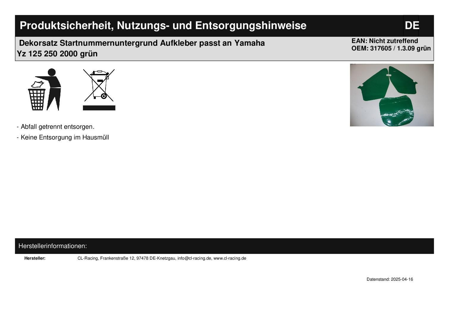 Dekorsatz Startnummernuntergrund Aufkleber passt an Yamaha Yz 125 250 2000 grün In dieser Auktion gibt es folgenden Artikel zu kaufen: Dekorsatz (siehe Foto) Modell: passend für Yamaha YZ 125, 250 Bj.: 00 Lieferumfang: siehe Foto Es werden nur die Aufkleber geliefert, die auf dem Foto zu sehen sind.