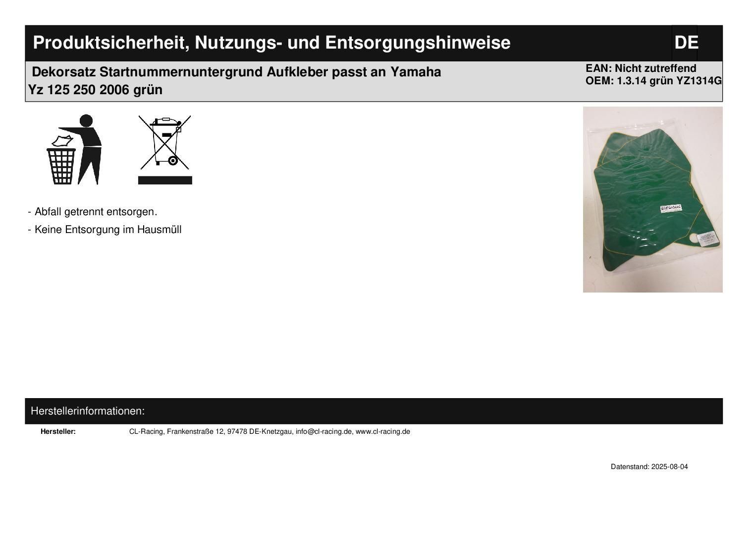 Dekorsatz Startnummernuntergrund Aufkleber passt an Yamaha Yz 125 250 2006 grün In dieser Auktion gibt es folgenden Artikel zu kaufen: Dekorsatz (siehe Foto) Modell: passend für Yamaha YZ 125, 250 Bj.: 06 Lieferumfang: siehe Foto Es werden nur die Aufkleber geliefert, die auf dem Foto zu sehen sind.