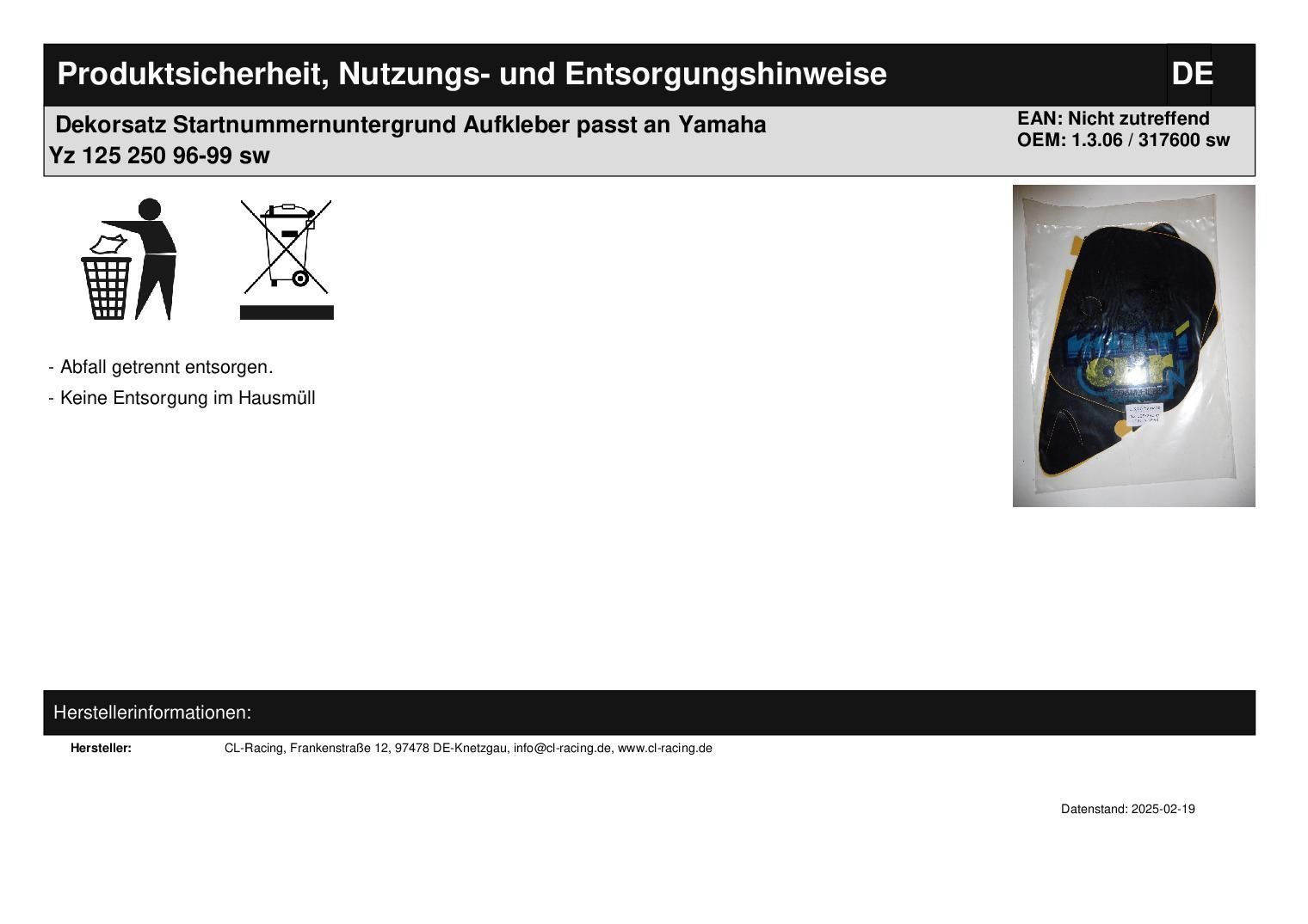 Dekorsatz Startnummernuntergrund Aufkleber passt an Yamaha Yz 125 250 96-99 sw