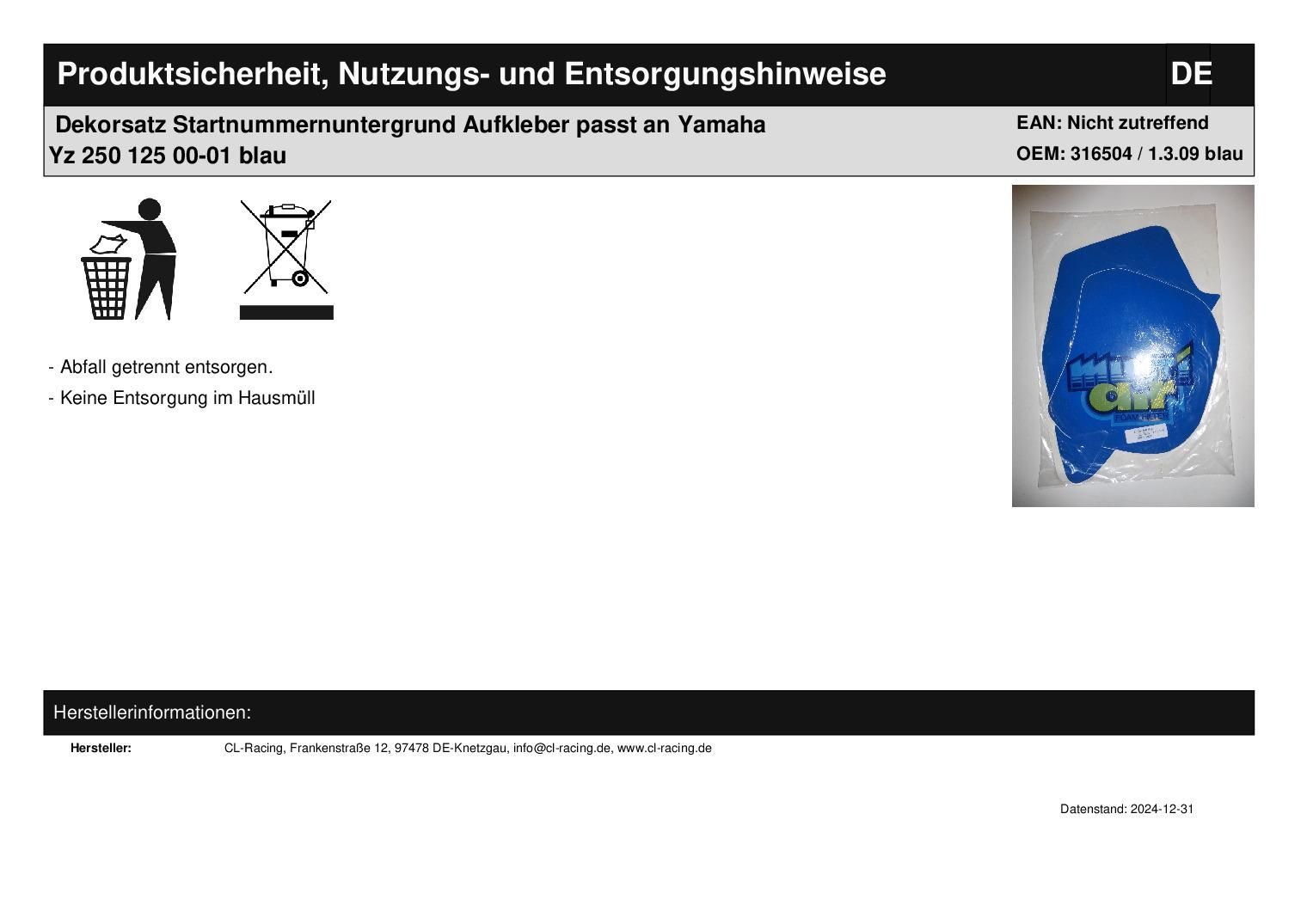 Dekorsatz Startnummernuntergrund Aufkleber passt an Yamaha Yz 250 125 00-01 blau