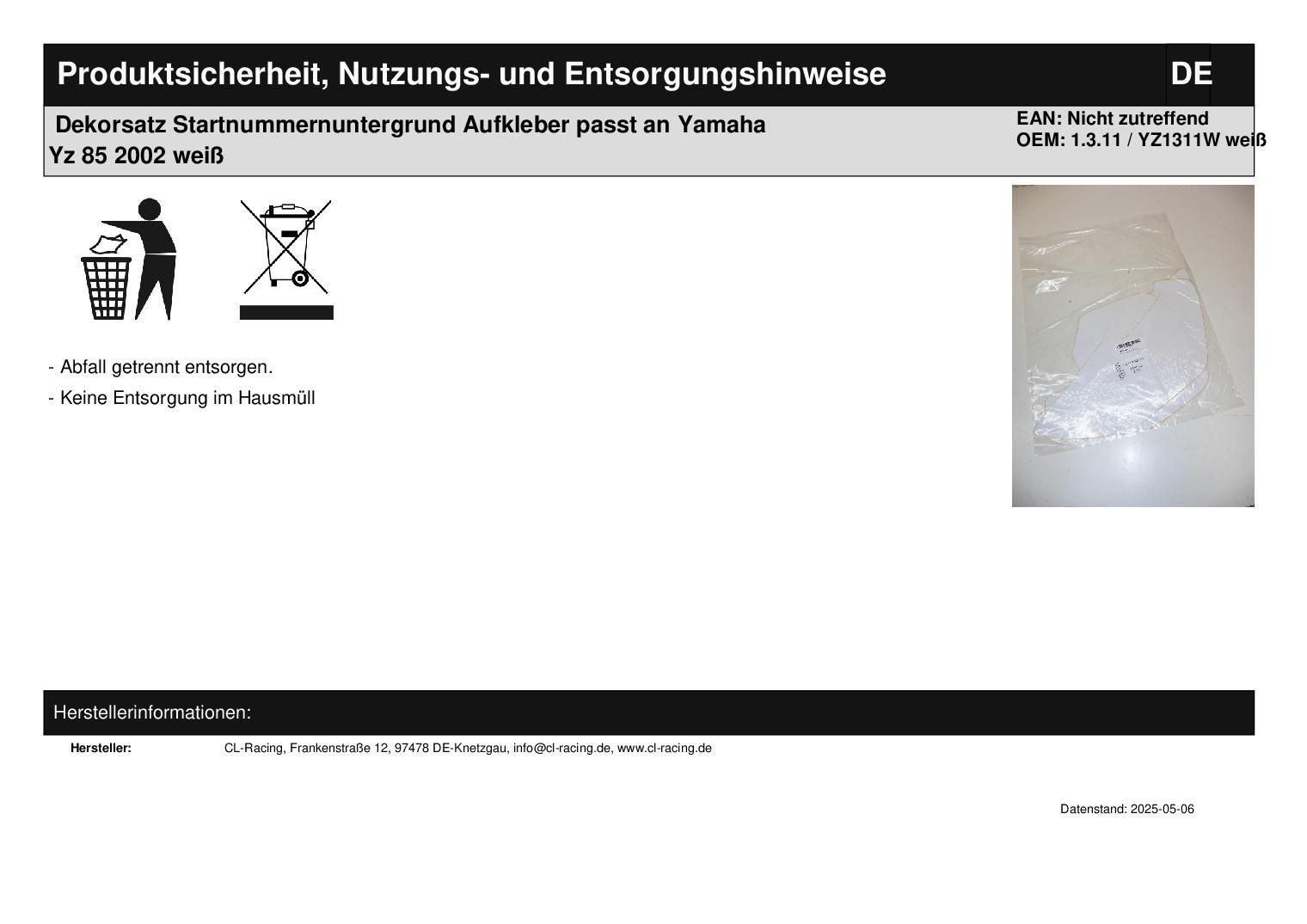 Dekorsatz Startnummernuntergrund Aufkleber passt an Yamaha Yz 85 2002 weiß