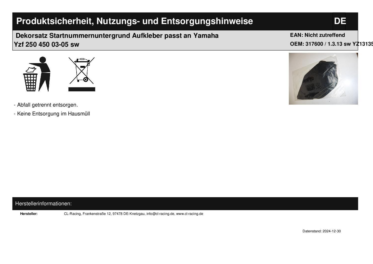 Dekorsatz Startnummernuntergrund Aufkleber passt an Yamaha Yzf 250 450 03-05 sw In dieser Auktion gibt es folgenden Artikel zu kaufen: Dekorsatz (siehe Foto) Modell: passend für Yamaha YZF 250, 450 Bj.: 03 - 05 Lieferumfang: siehe Foto Es werden nur die Aufkleber geliefert, die auf dem Foto zu sehen