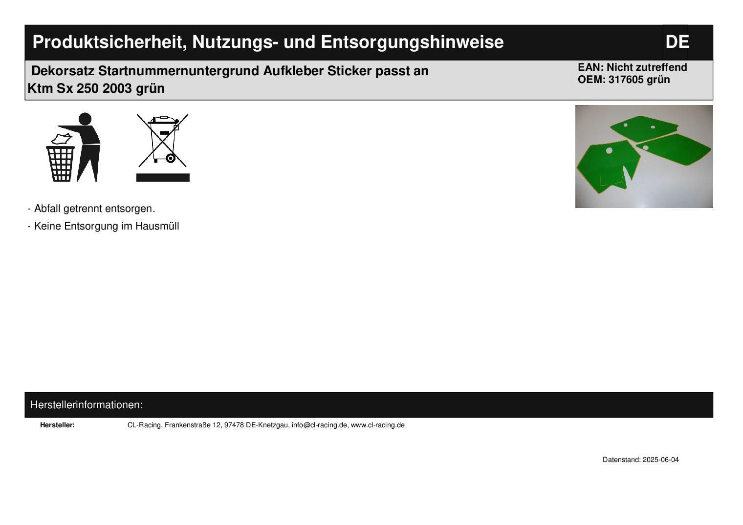 Dekorsatz Startnummernuntergrund Aufkleber Sticker passt an Ktm Sx 250 2003 grün In dieser Auktion gibt es folgenden Artikel zu kaufen: Dekorsatz (siehe Foto) Modell: passend für Ktm SX 200, 250, 450 Bj.: 03 Lieferumfang: siehe Foto Es werden nur die Aufkleber geliefert, die auf dem Foto zu sehen si