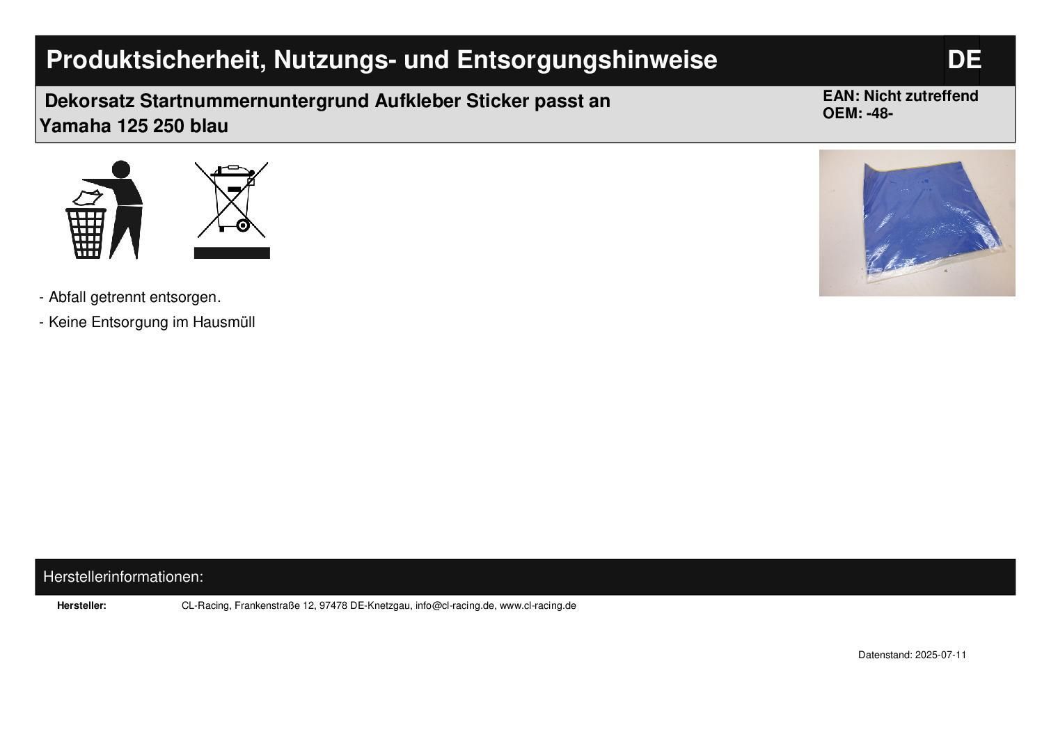 Dekorsatz Startnummernuntergrund Aufkleber Sticker passt an Yamaha 125 250 blau