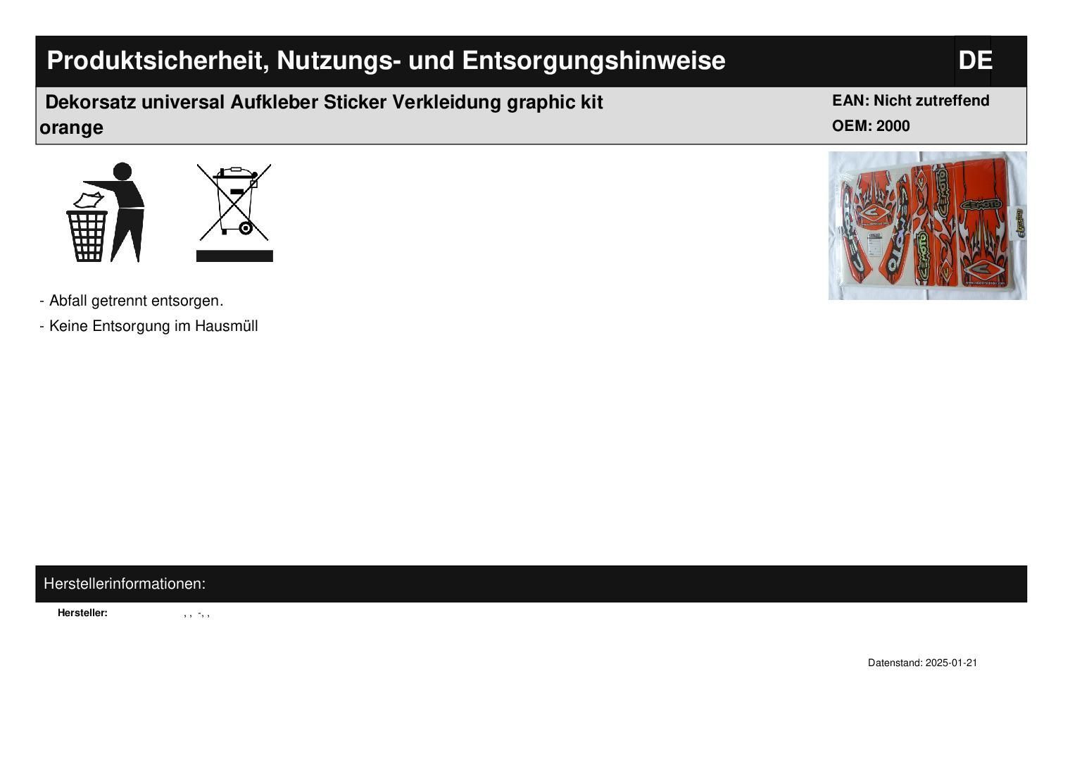 Dekorsatz universal Aufkleber Sticker Verkleidung graphic kit orange In dieser Auktion gibt es folgenden Artikel zu kaufen: Dekorsatz (siehe Foto) Modell: passend für universal Lieferumfang: siehe Foto Es werden nur die Aufkleber geliefert, die auf dem Foto zu sehen sind. Artikelzustand: neu aus Ges