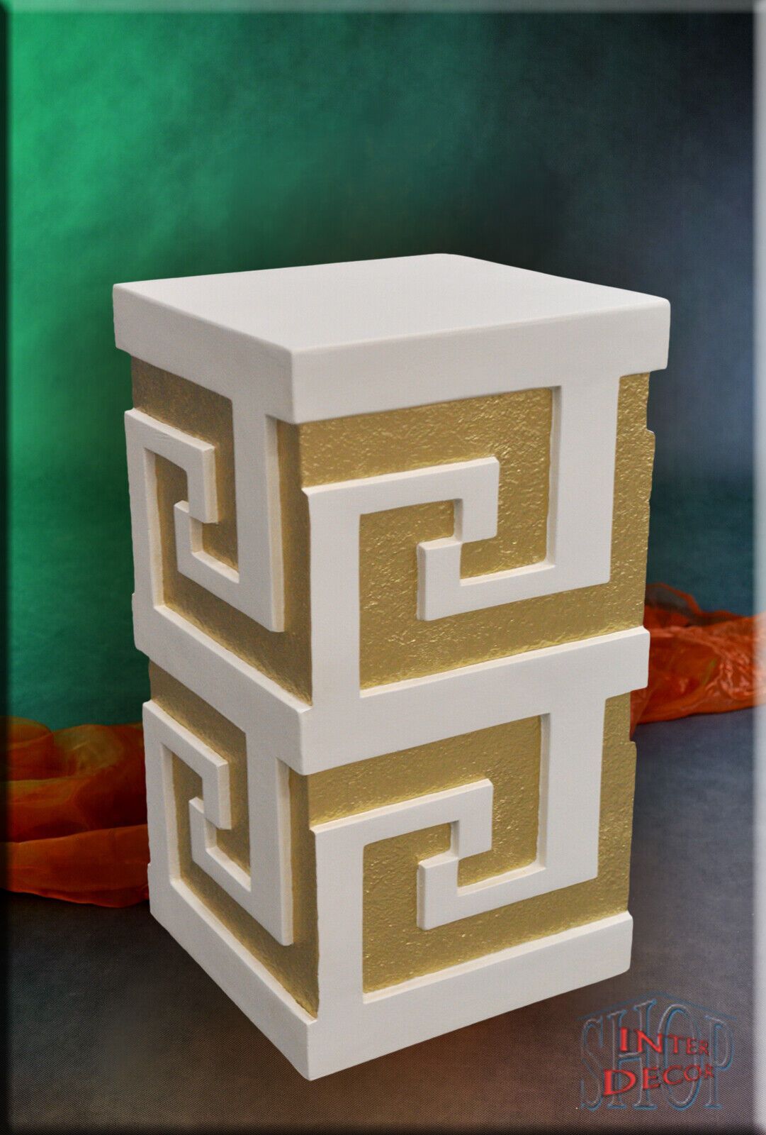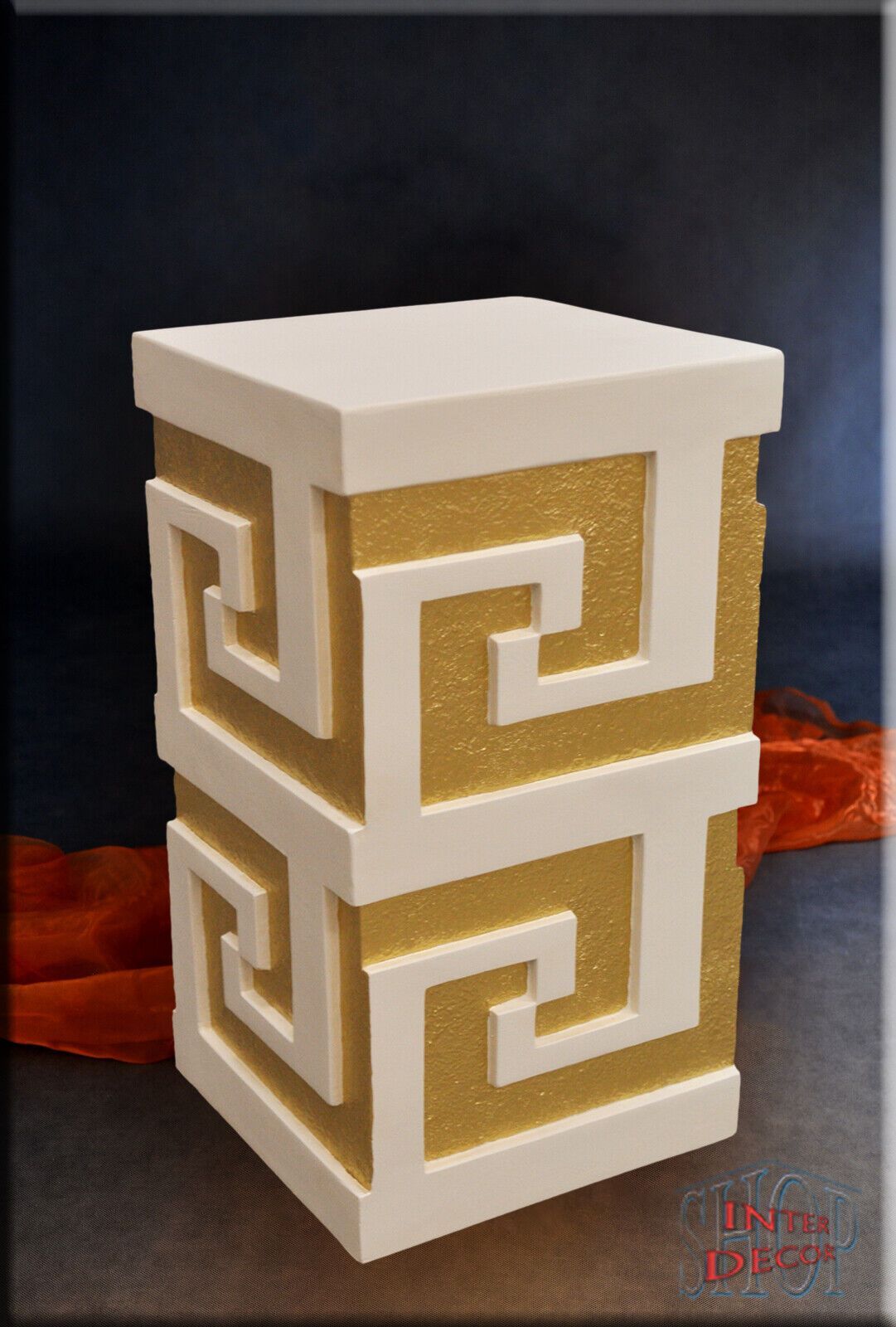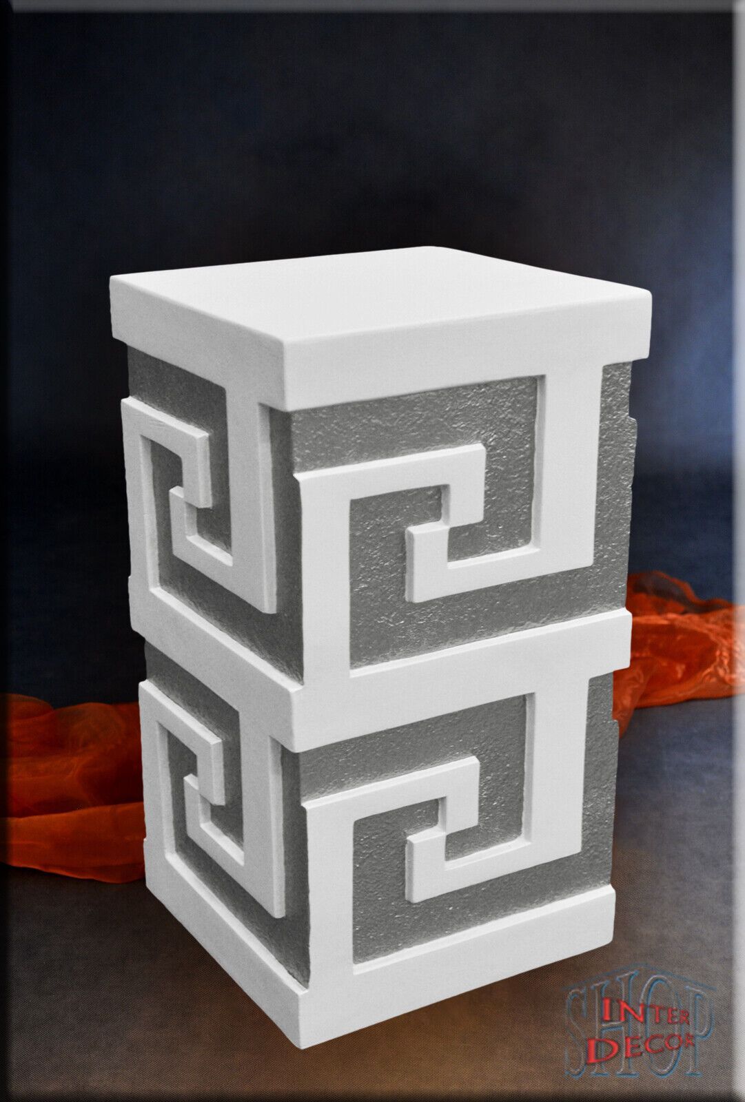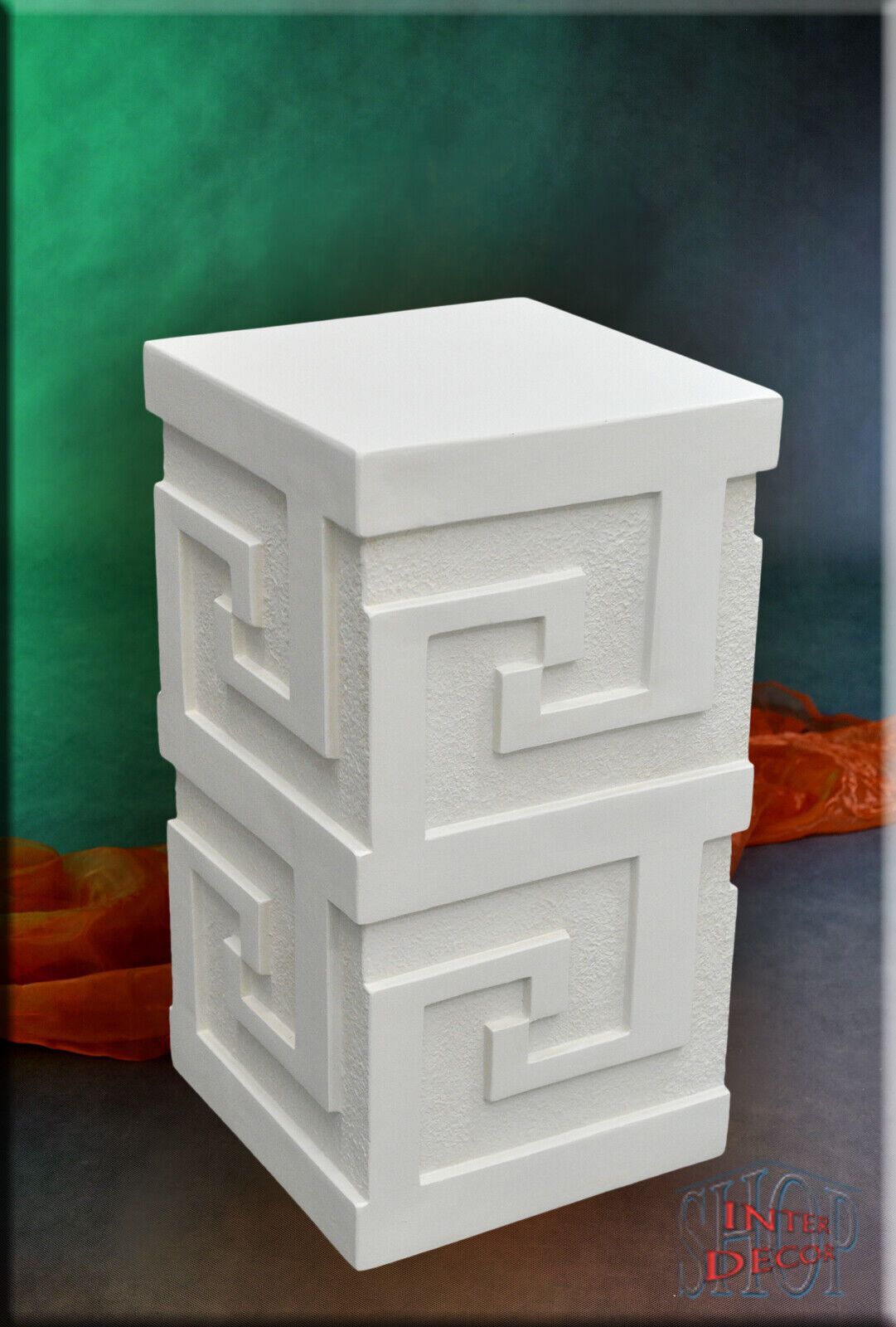 Designer Podest Mäander” 1104 P HANDARBEIT Material : Kunstharz Farbe : Die verfügbare Farben Muster sind unten aufgeführt. Höhe ca : 55 cm Breite ca : 30 cm Tiefe ca : 30 cm Gewicht ca : 7,5 kg Lieferzeit : 2 bis 5 Wochen Für Innen und Außenbereich !!! Dieser Podest ist in Handarbeit Verfahre