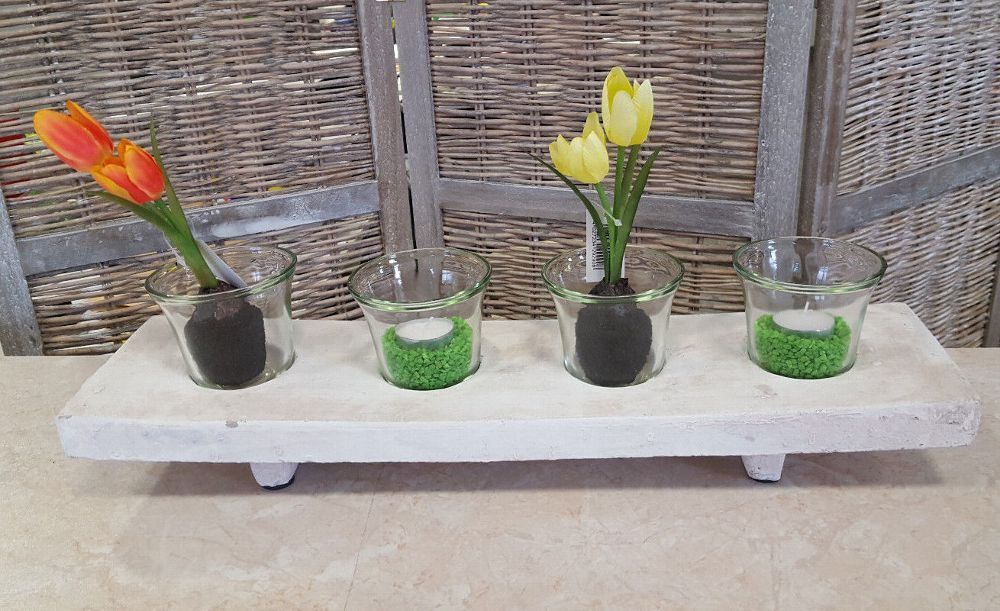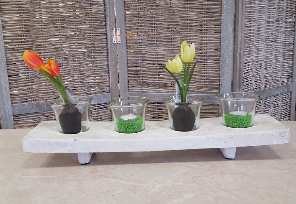 Deko-Leuchter für den Tisch und Gläsern 54 x 14 cm, cremefarben aus massiven Polymergemisch. Sehr natürliche Optik. Auch mit Deko lieferbar (bestehend aus: 2 Tulpen Kunstblumen, DekoSand, 2 Teelichter).