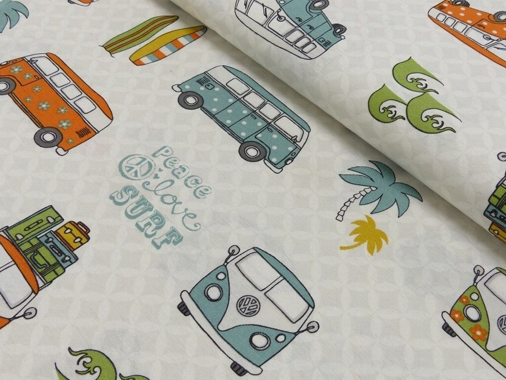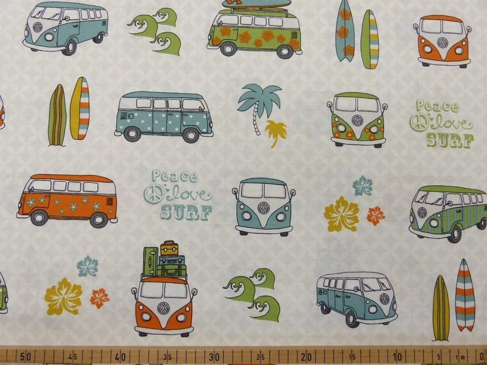 Dekostoff BW Polyester ecru VW Bulli T1 peace love surf, Verkaufseinheit 0,25 m