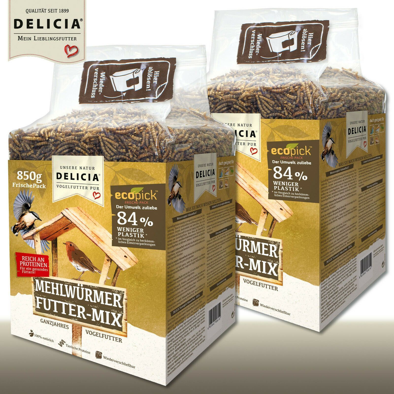 Delicia 2x850 g Mehlwürmer Futter-Mix Picknic ecopick Gartenvögel Igel Reptilien