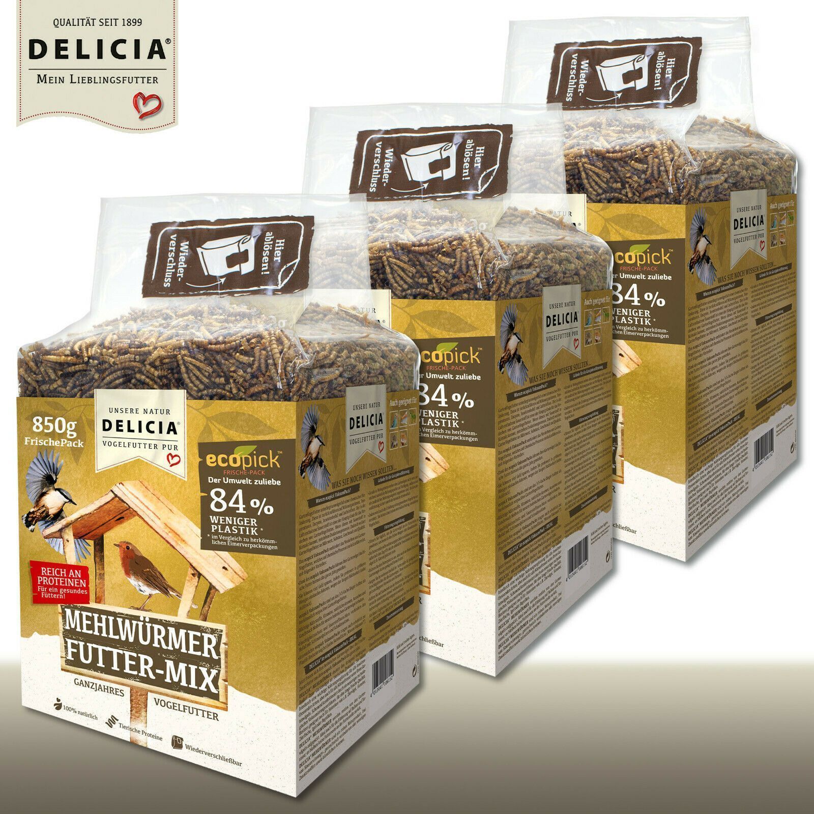 Delicia 3x850 g Mehlwürmer Futter-Mix Picknic ecopick Gartenvögel Igel Reptilien